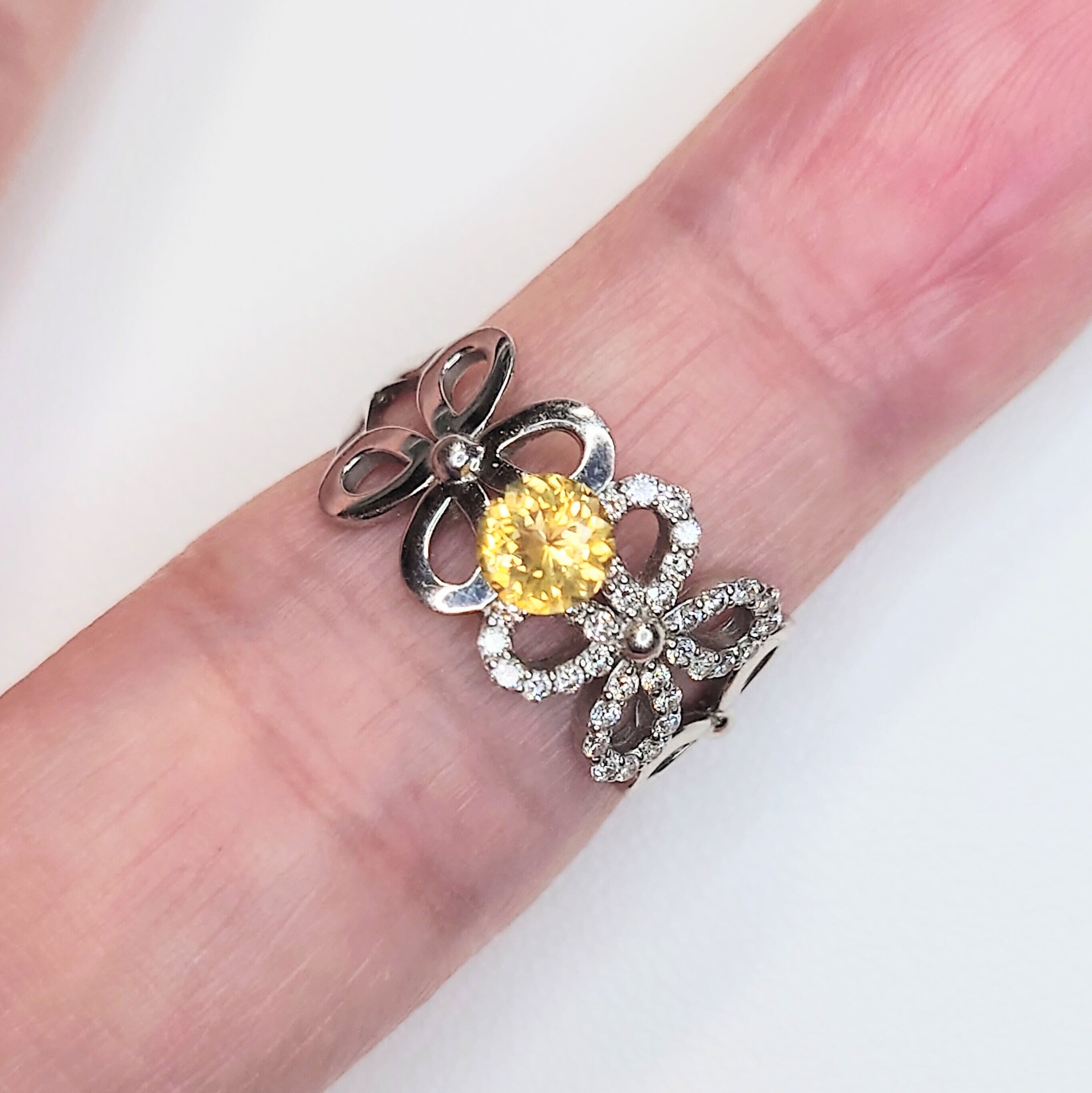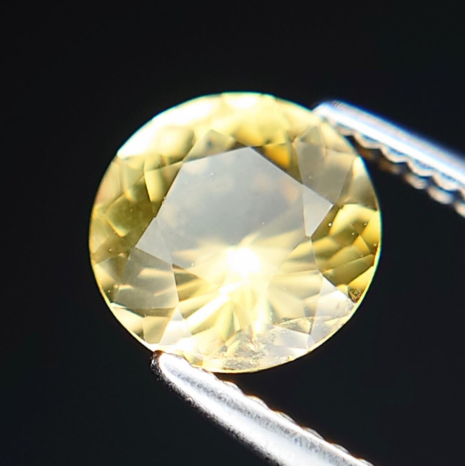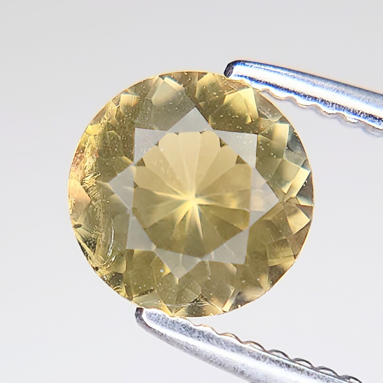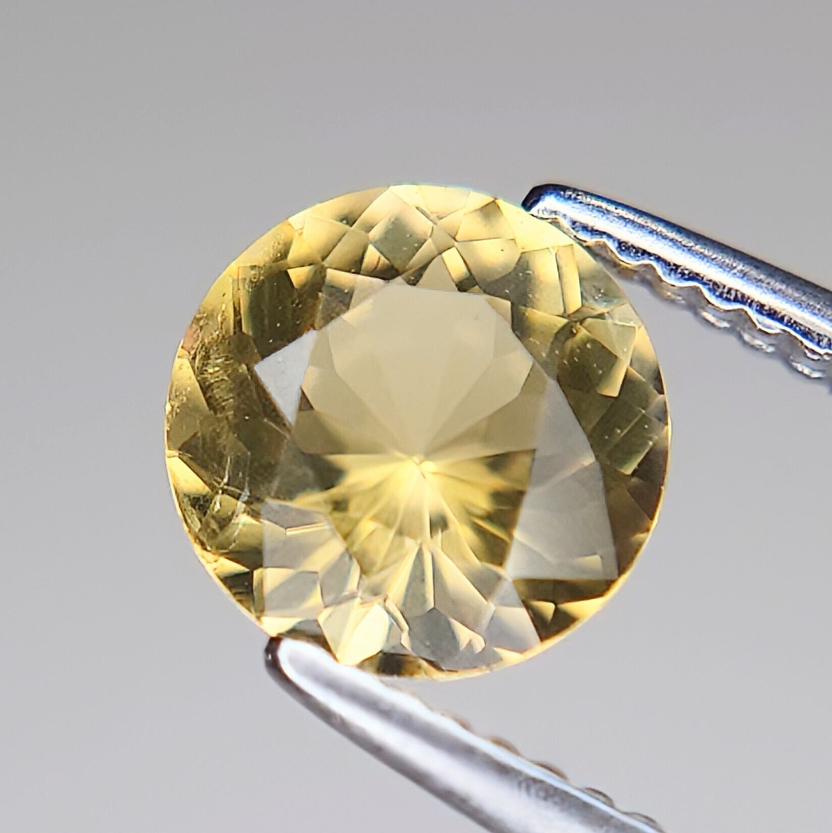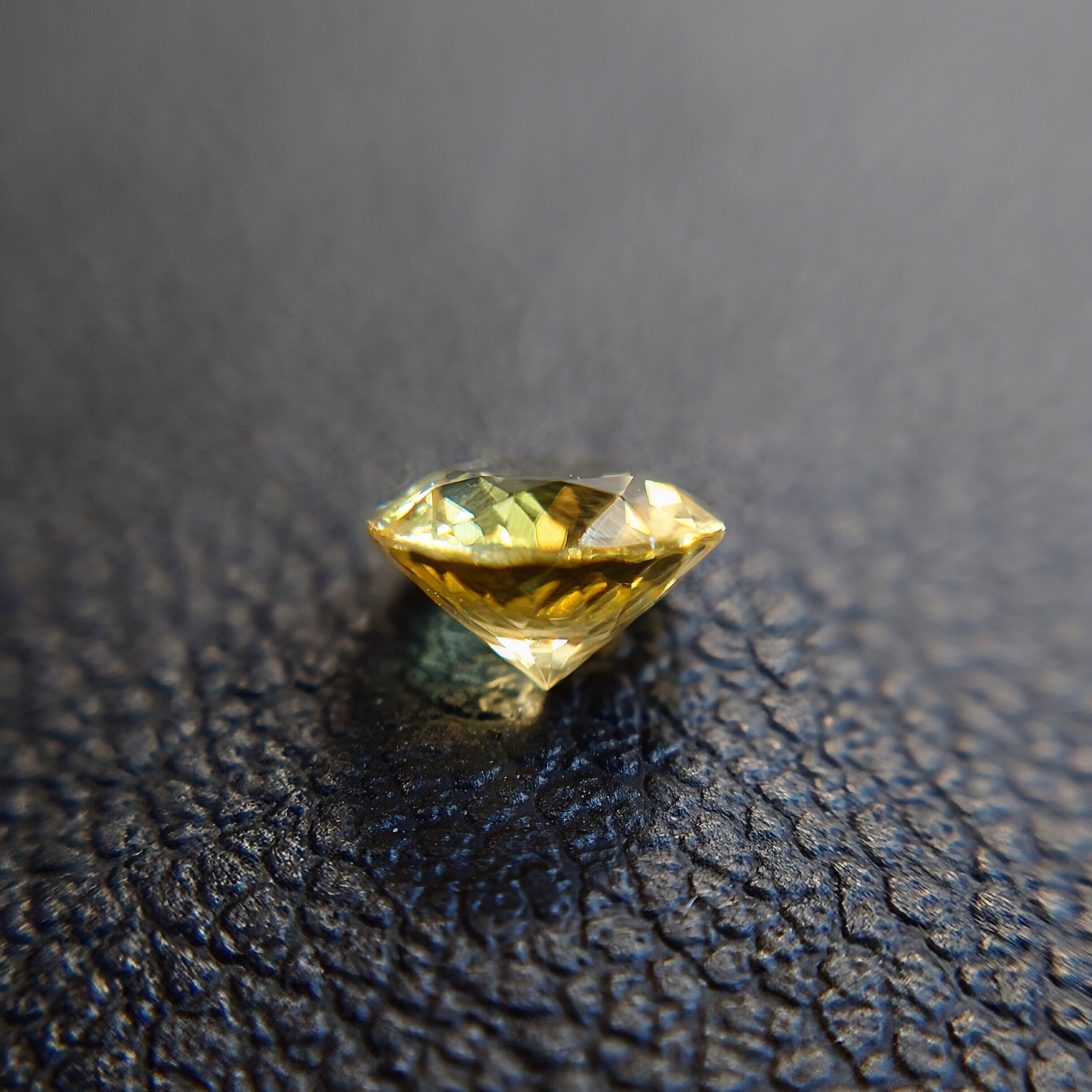 本石は、落ち着いた イエロー〜ゴールドカラー が美しく、光を受けると内部から星状に広がるようなファセットの輝きが印象的。ラウンドモディファイドブリリアントカットにより、コンドロダイト特有の温かみのある色彩と透明感がしっかりと引き出されています。