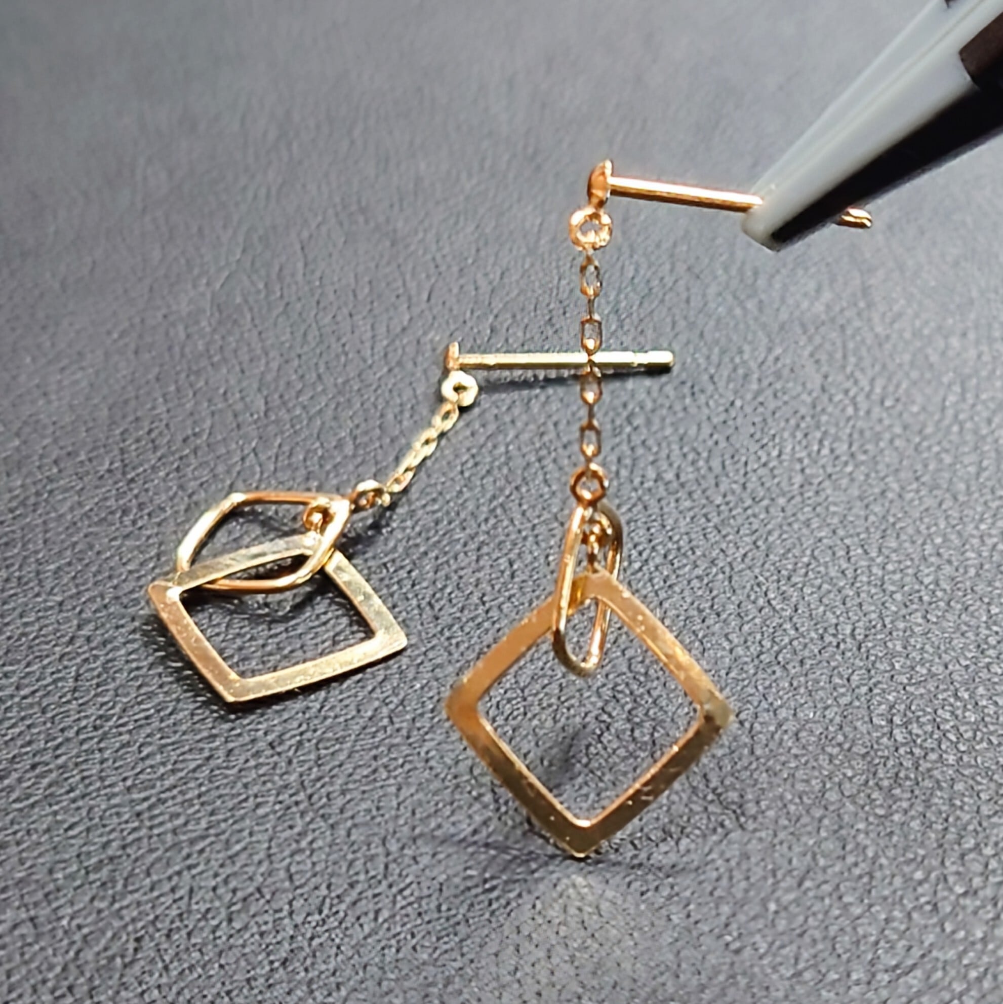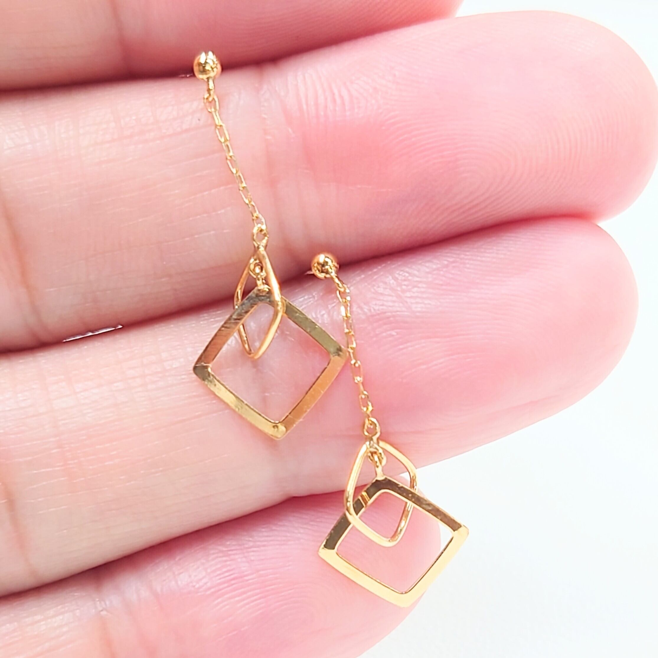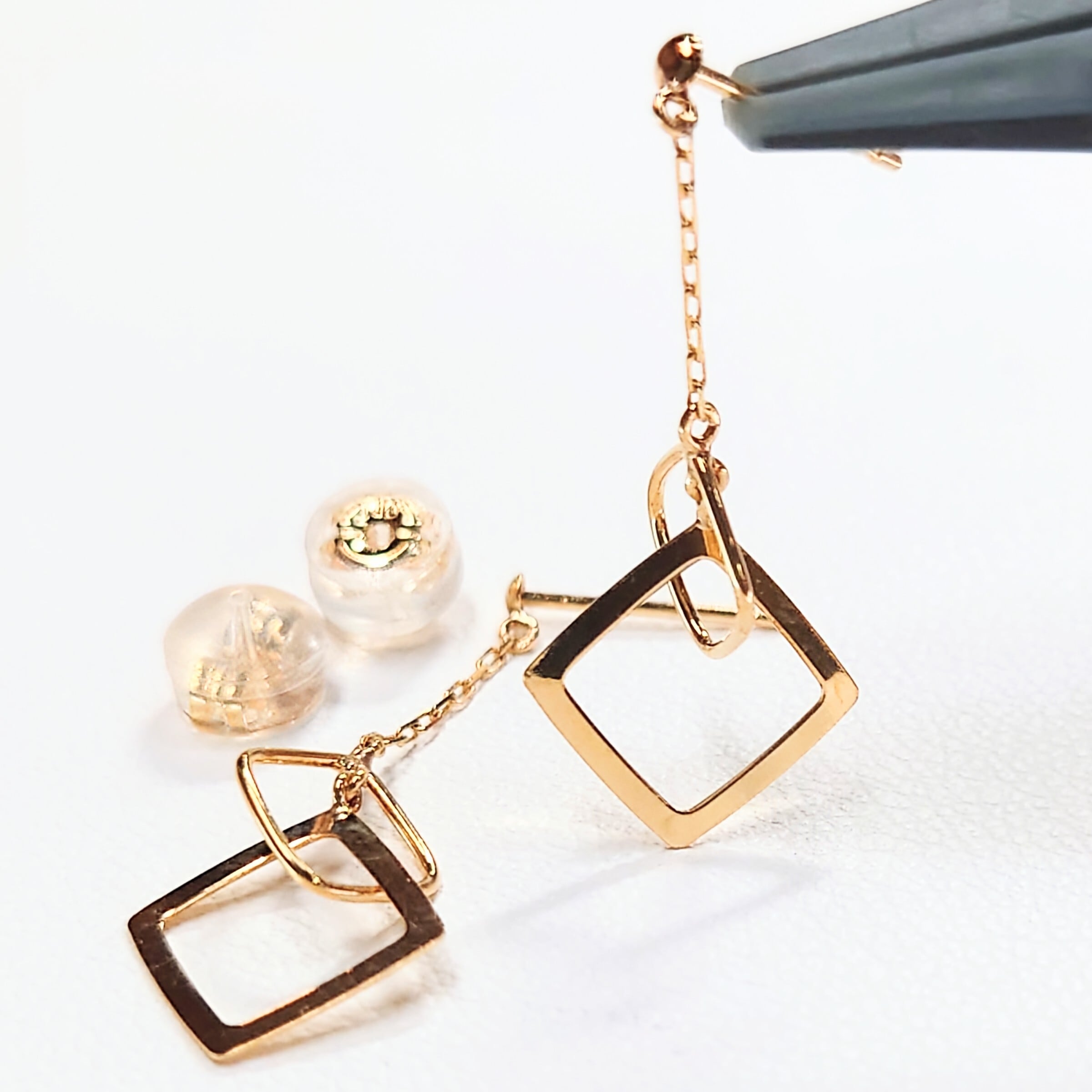 軽やかに揺れるチェーンと、重なり合うスクエアモチーフが印象的なピアス。