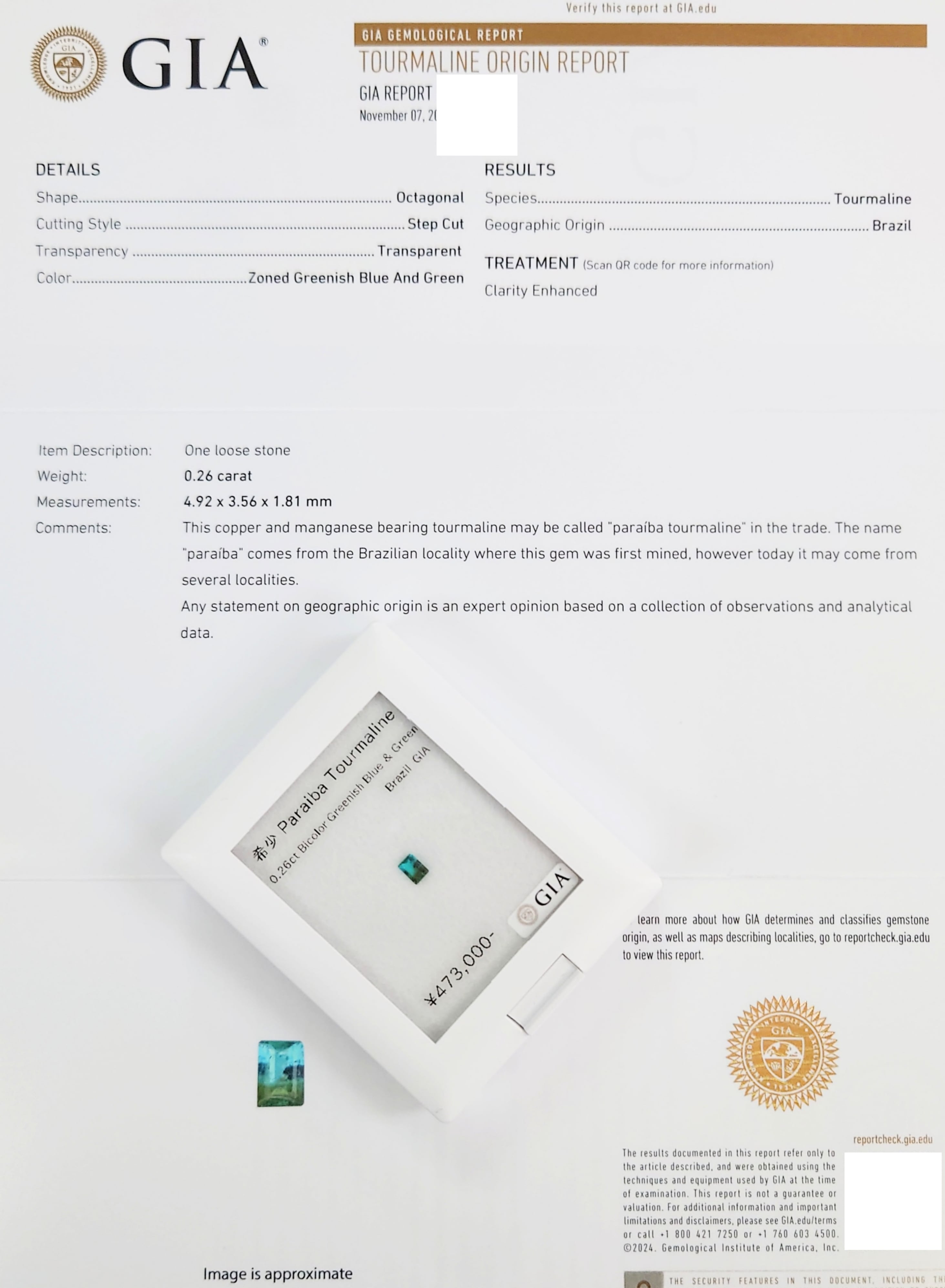 透明材の含浸処理(Clarity Enhanced)が施されていますが、パライバトルマリンにおいては一般的に流通する処理であり、外観の美しさを引き立てる要素の一つです。