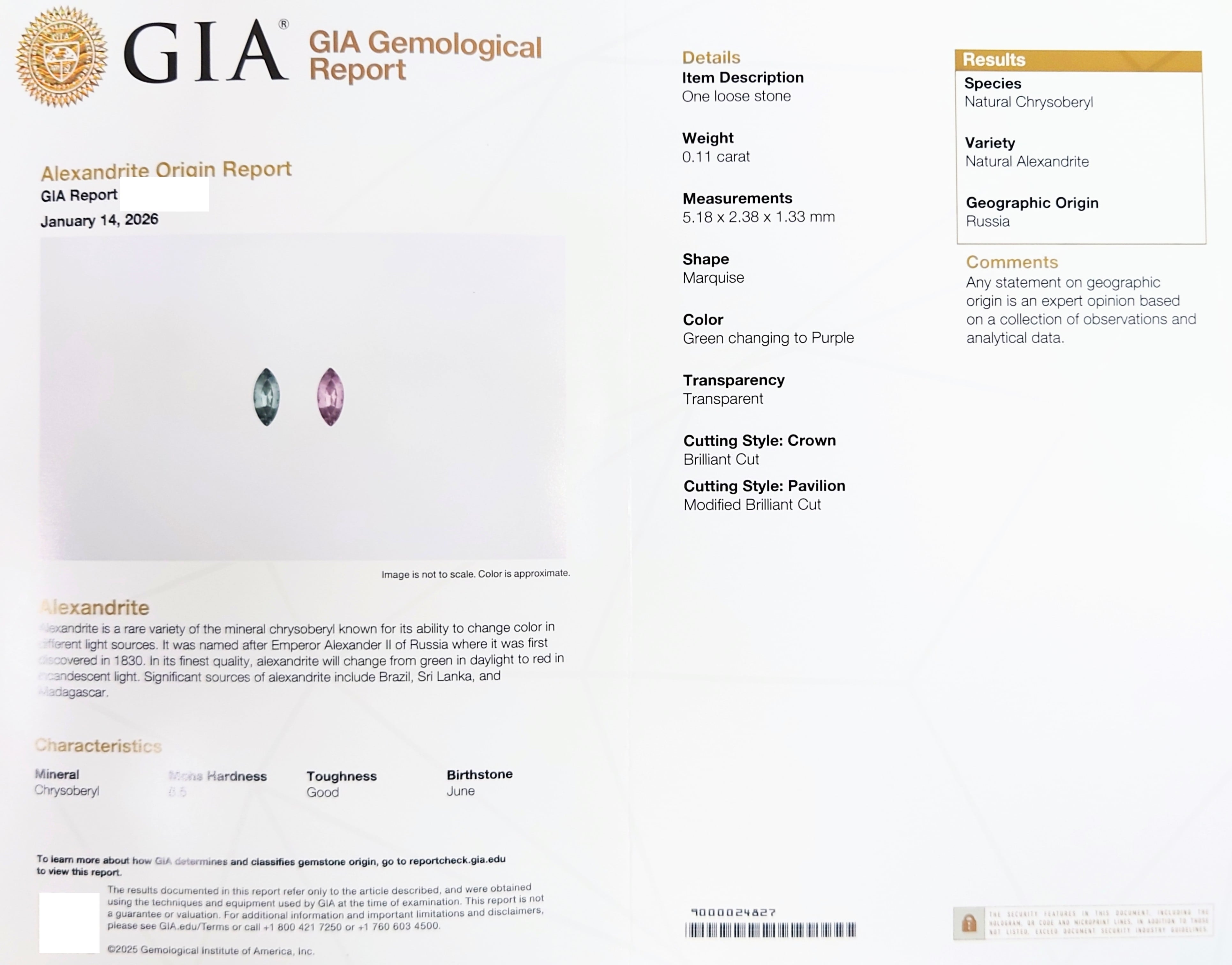 ・付属:GIA Alexandrite Origin Report