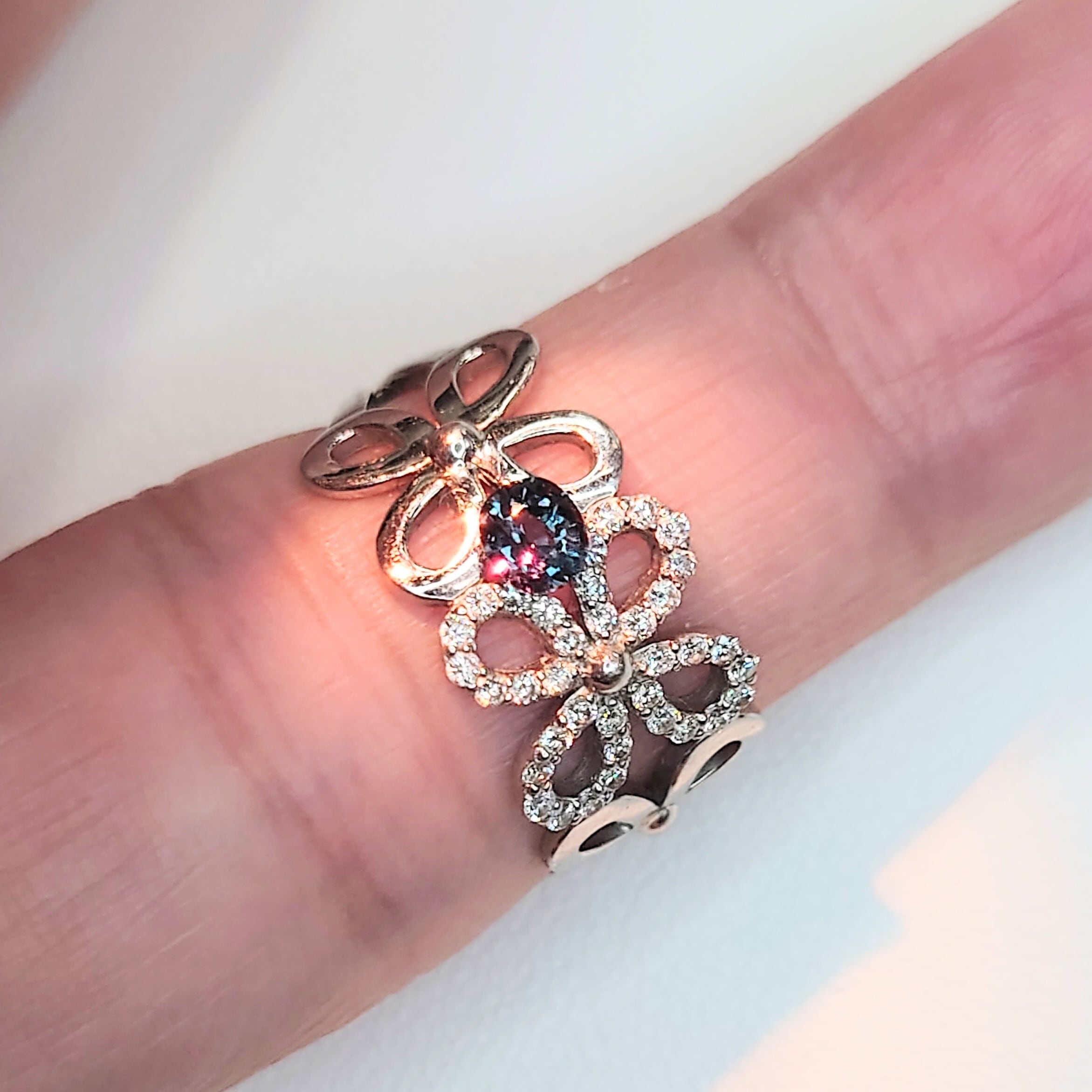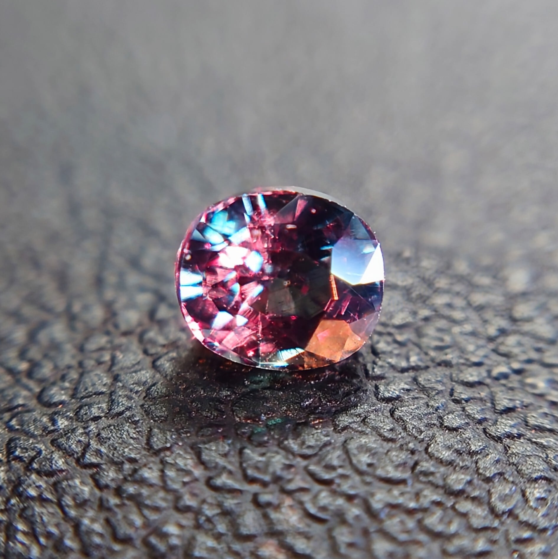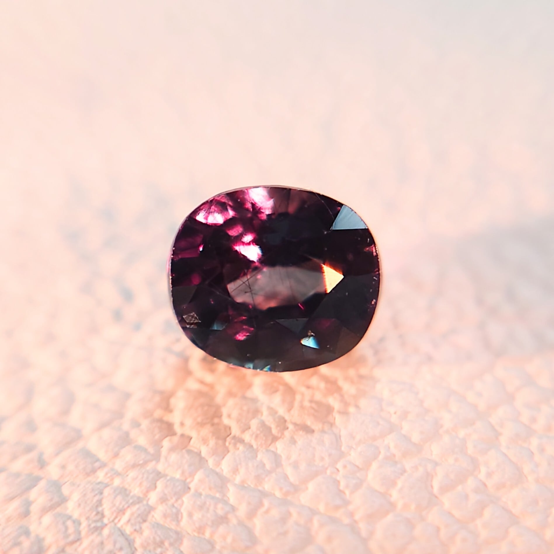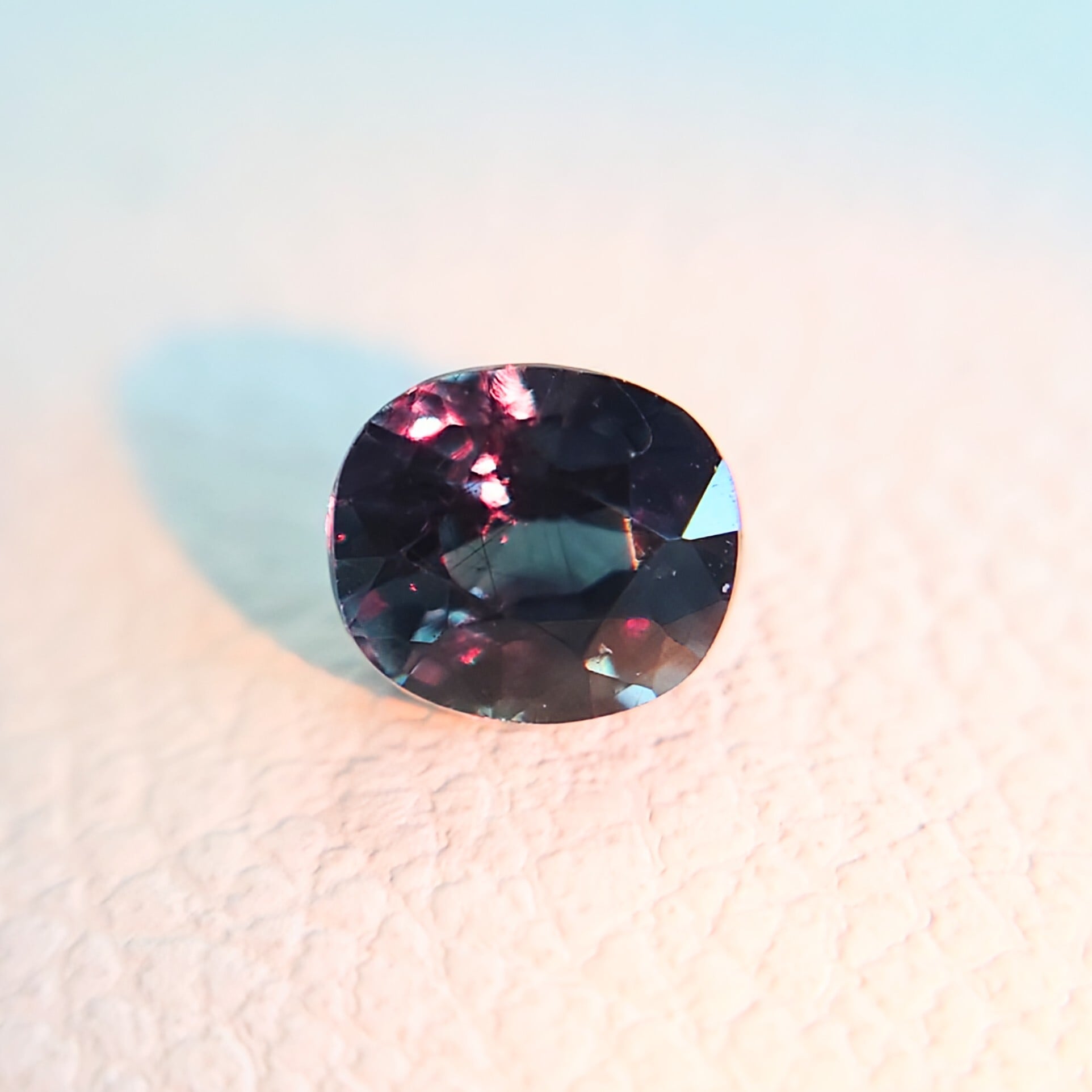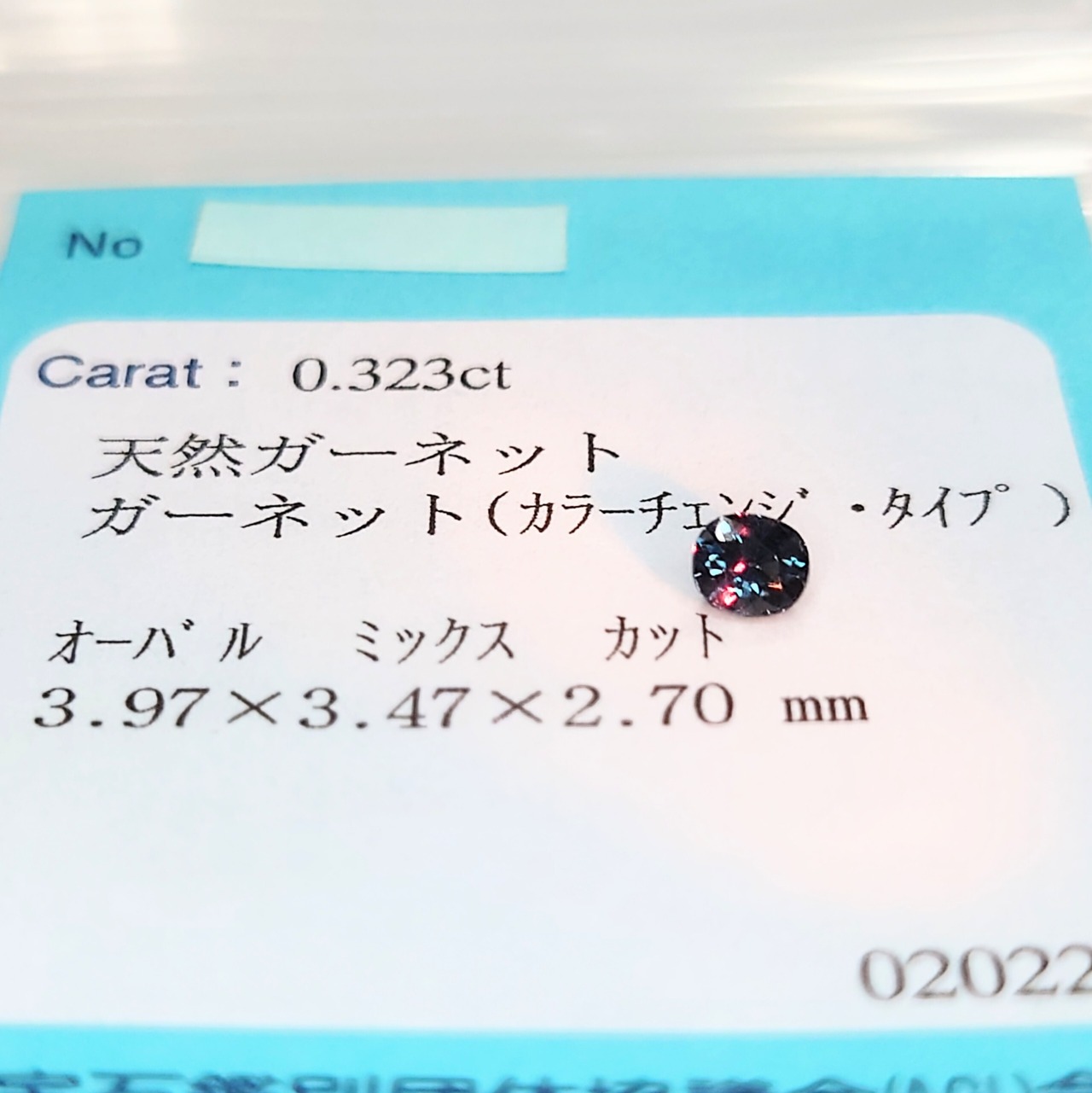 カットは整ったオーバルミックスカットで、ファセットから放たれるシャープな輝きと共に、カラーチェンジのコントラストを美しく引き立てます。