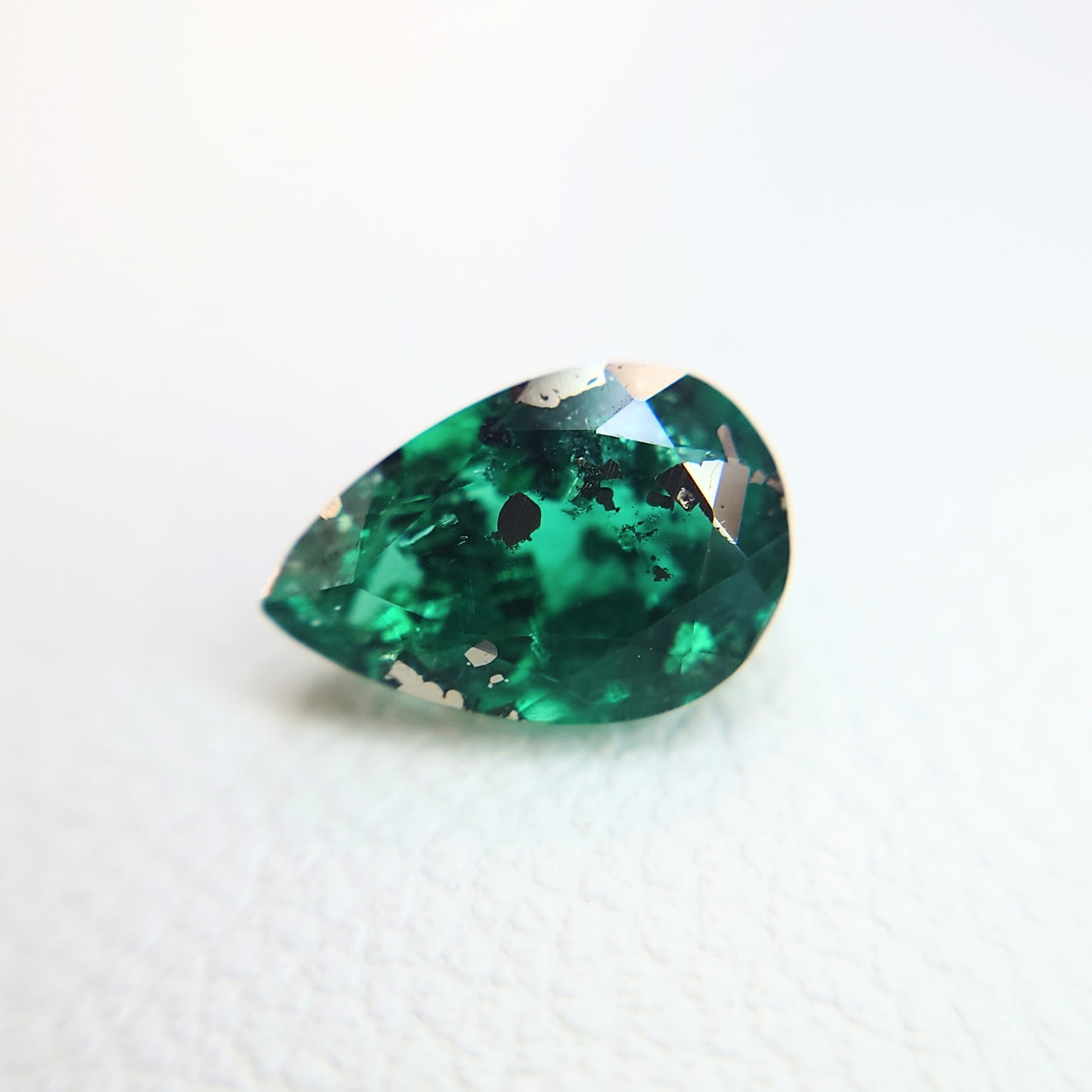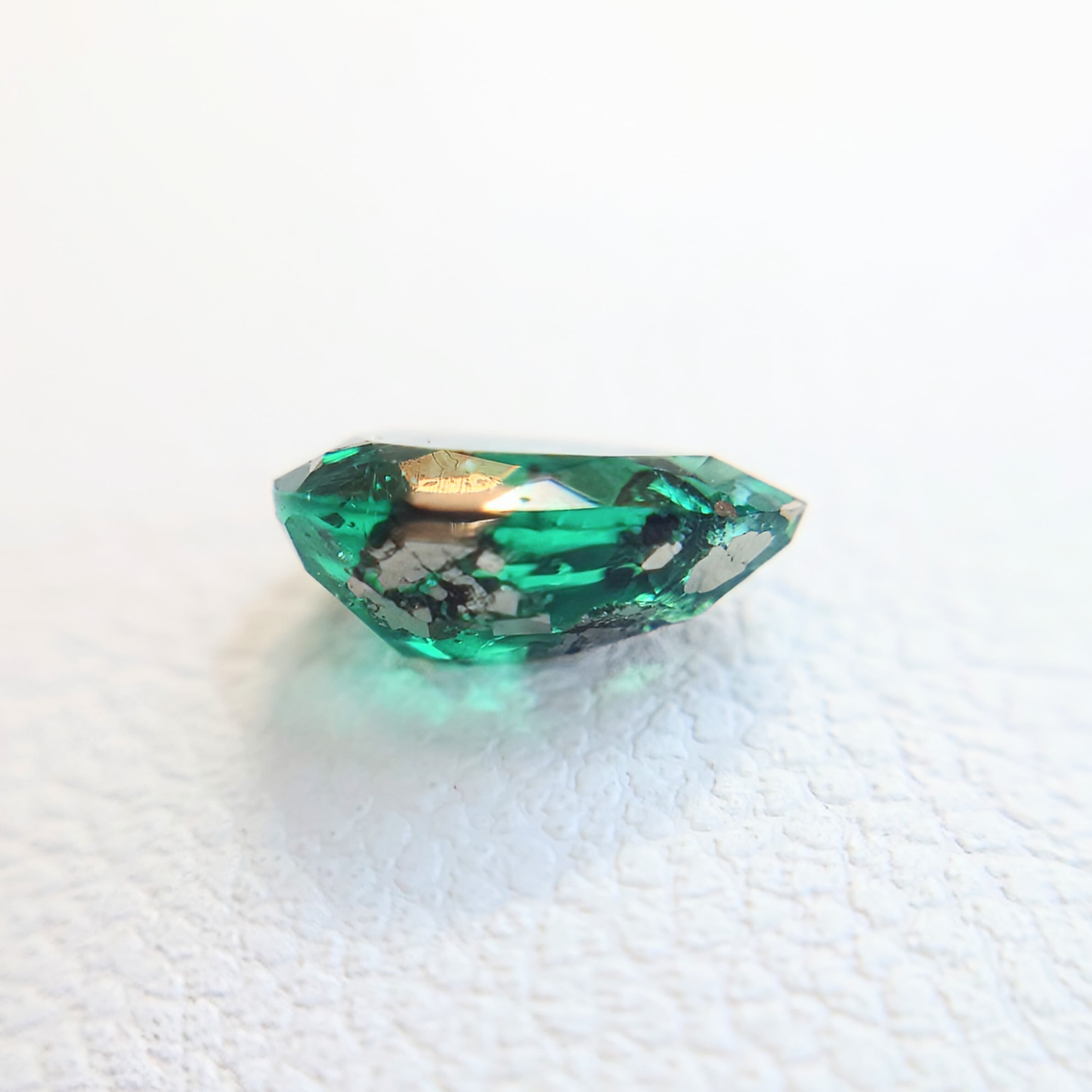 深みのあるエメラルドグリーンの中に浮かぶパイライトは、まるで宇宙や鉱物標本を閉じ込めたかのような独特の表情を見せ、通常の宝石質エメラルドとは一線を画すコレクターズストーンです。