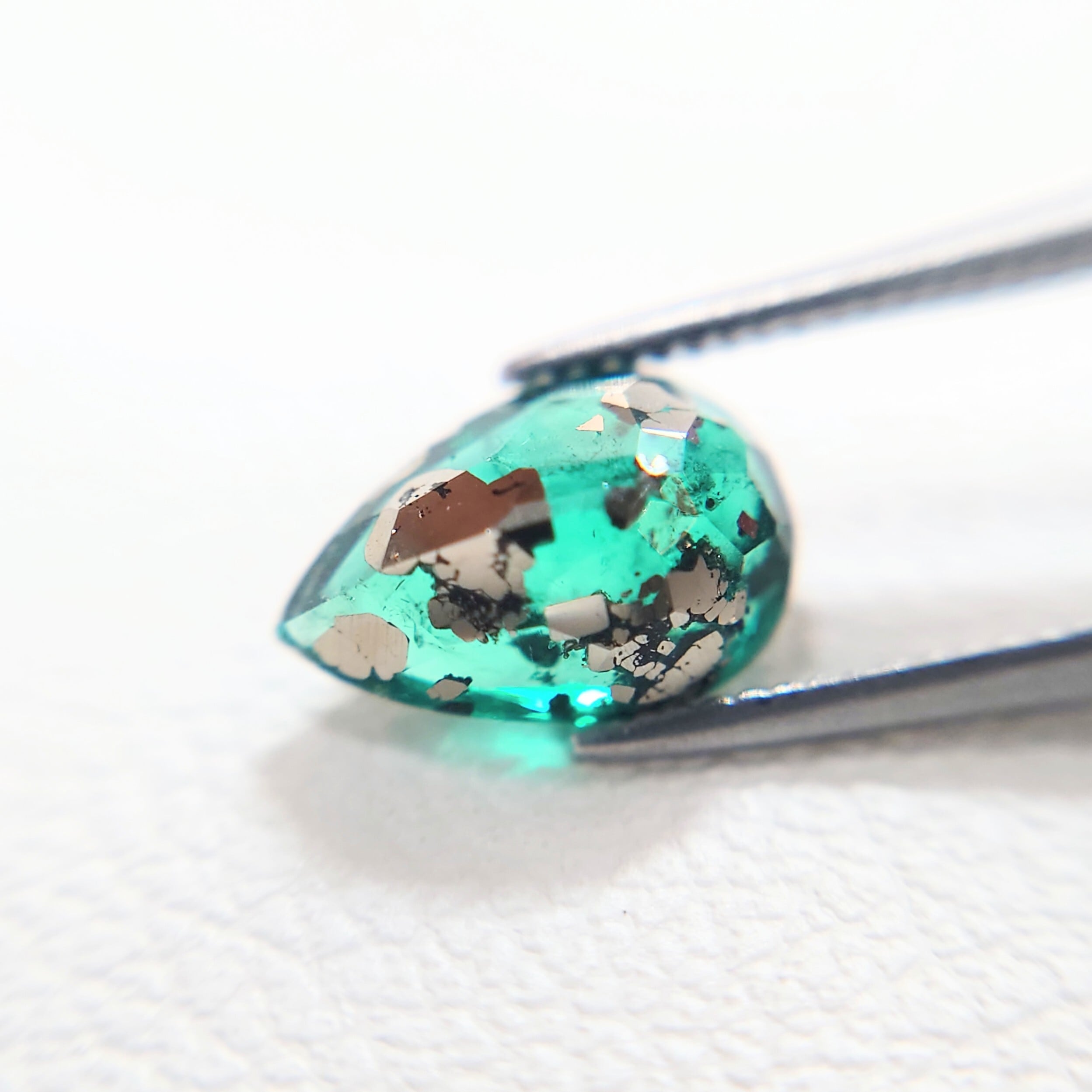 鮮やかなグリーンのエメラルドの内部に、金属光沢を放つパイライト結晶が内包された非常に個性的な一石です。