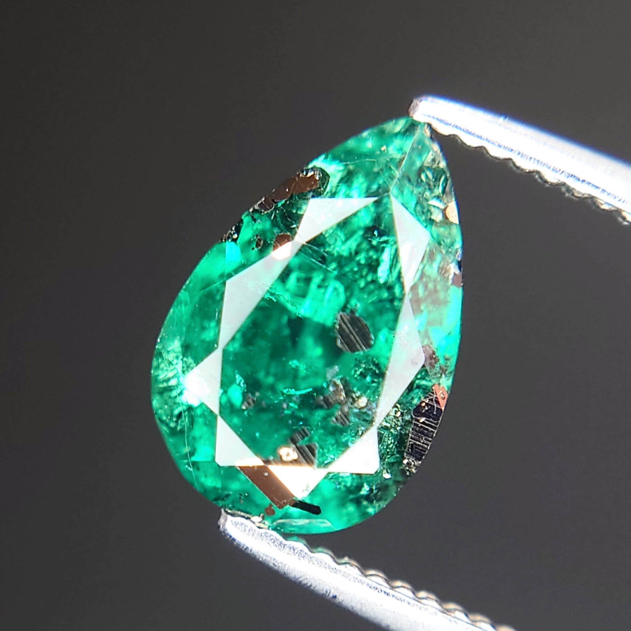 一般的なエメラルドに見られるジャルダンとは異なり、黒色〜金色のパイライトが結晶の形を保ったまま内包されており、天然鉱物ならではの景色を楽しむことができます。