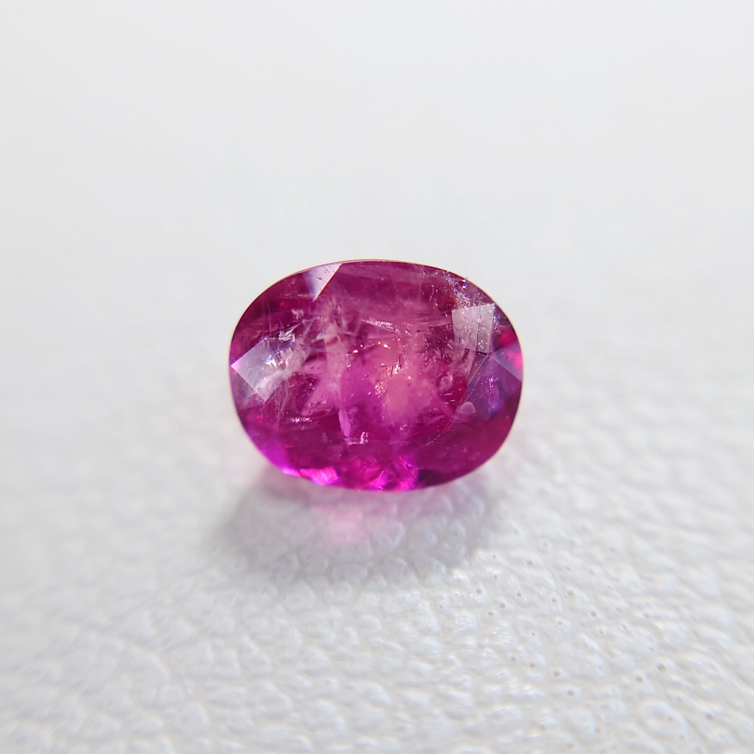 本石は0.594ctと、この宝石としては特筆すべきサイズを有し、鮮烈で濃密なピンクレッドの発色が印象的な一石です。