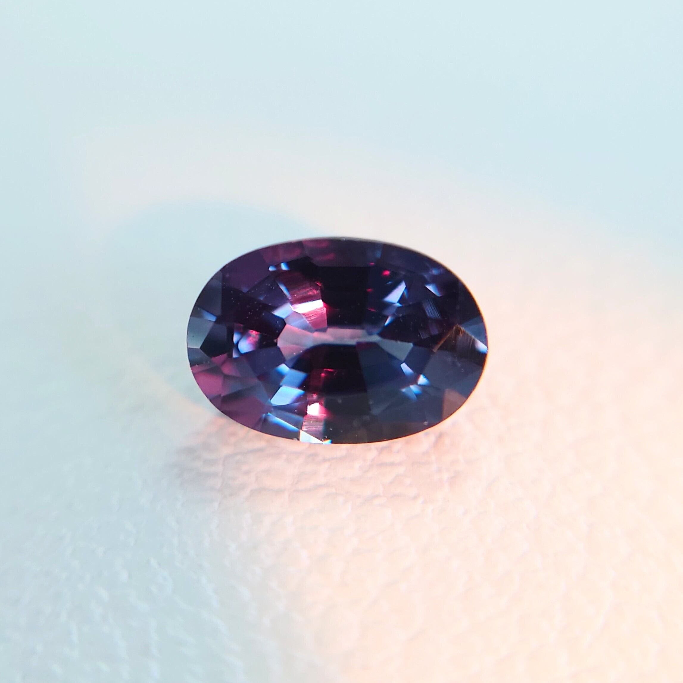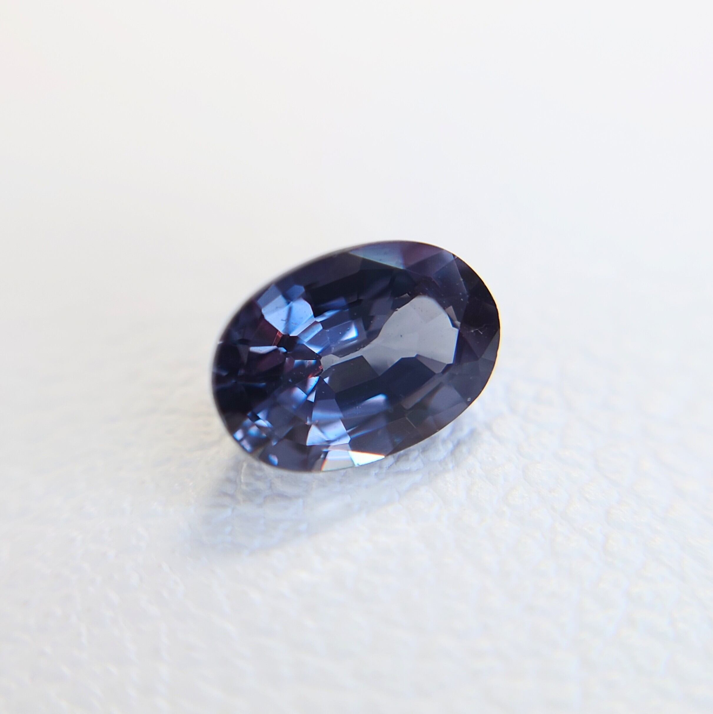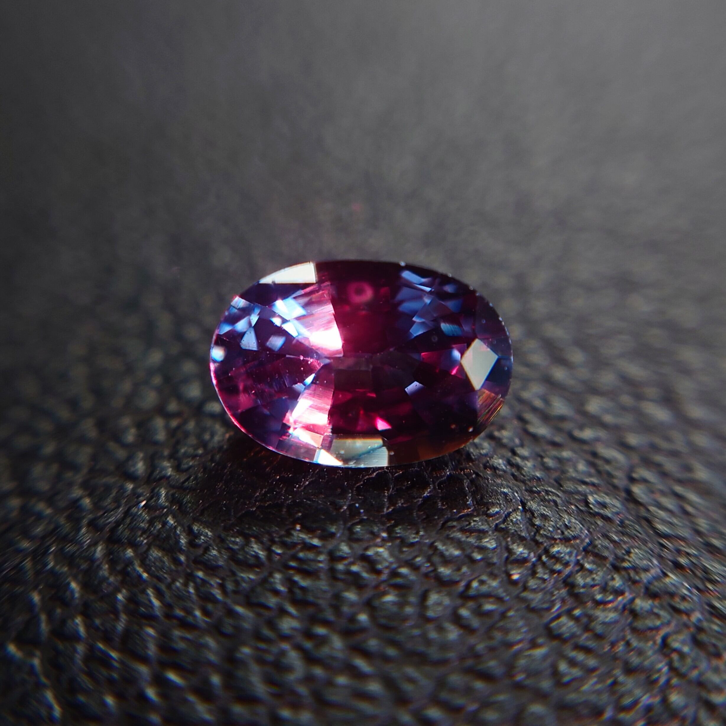 本石は、光源によって鮮やかなブルーから艶やかなレディッシュパープルへと表情を変える、魅惑的なカラーチェンジを備えた一石です。