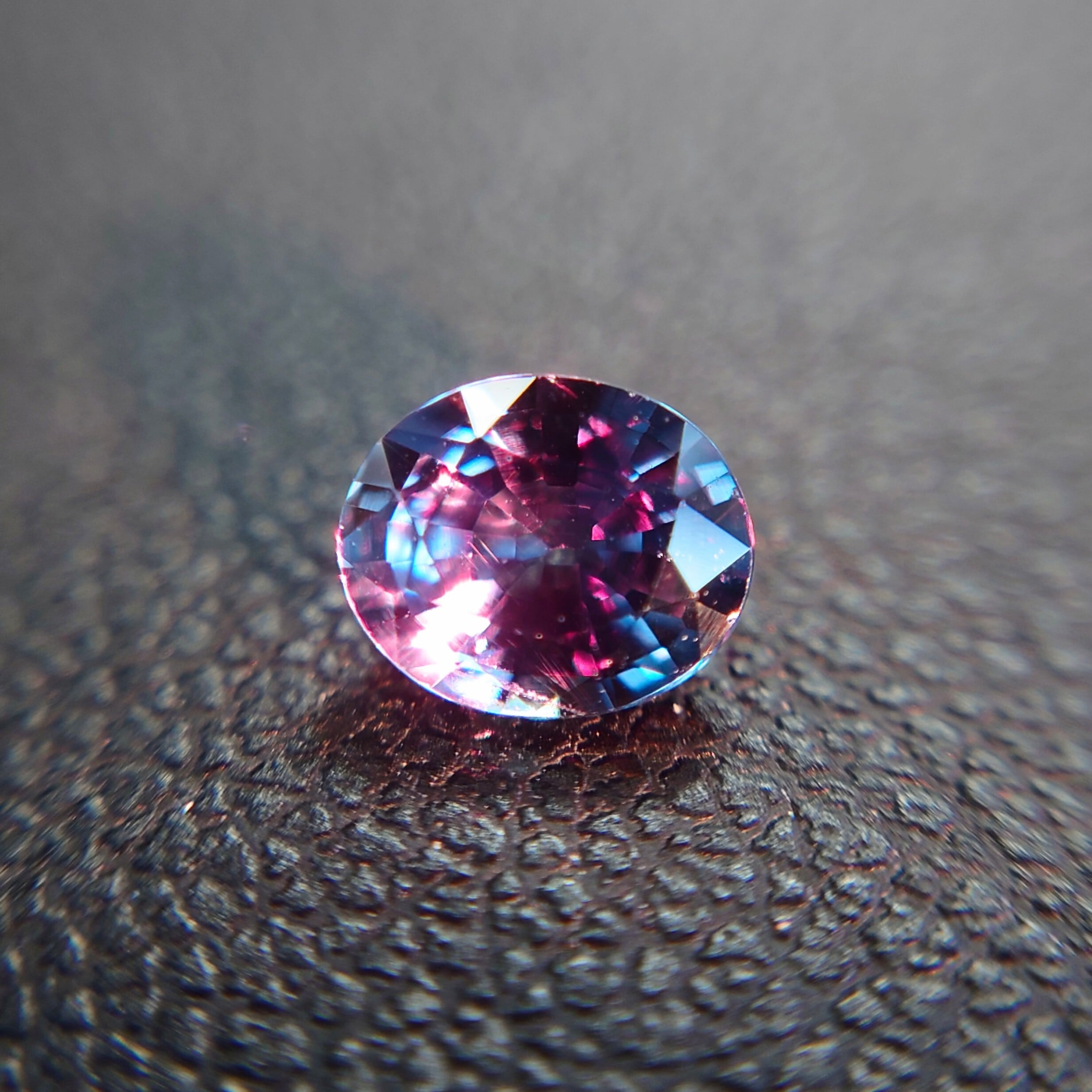 本石は、光源によって鮮やかなブルーから艶やかなレディッシュパープルへと表情を変える、魅惑的なカラーチェンジを備えた一石です。