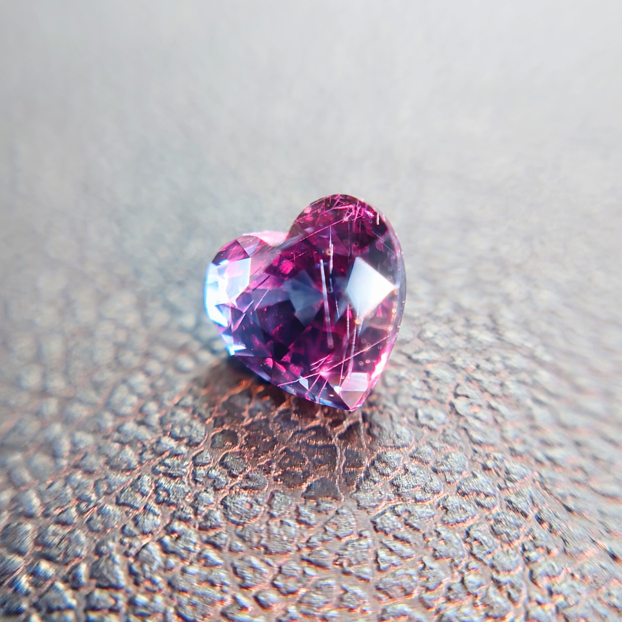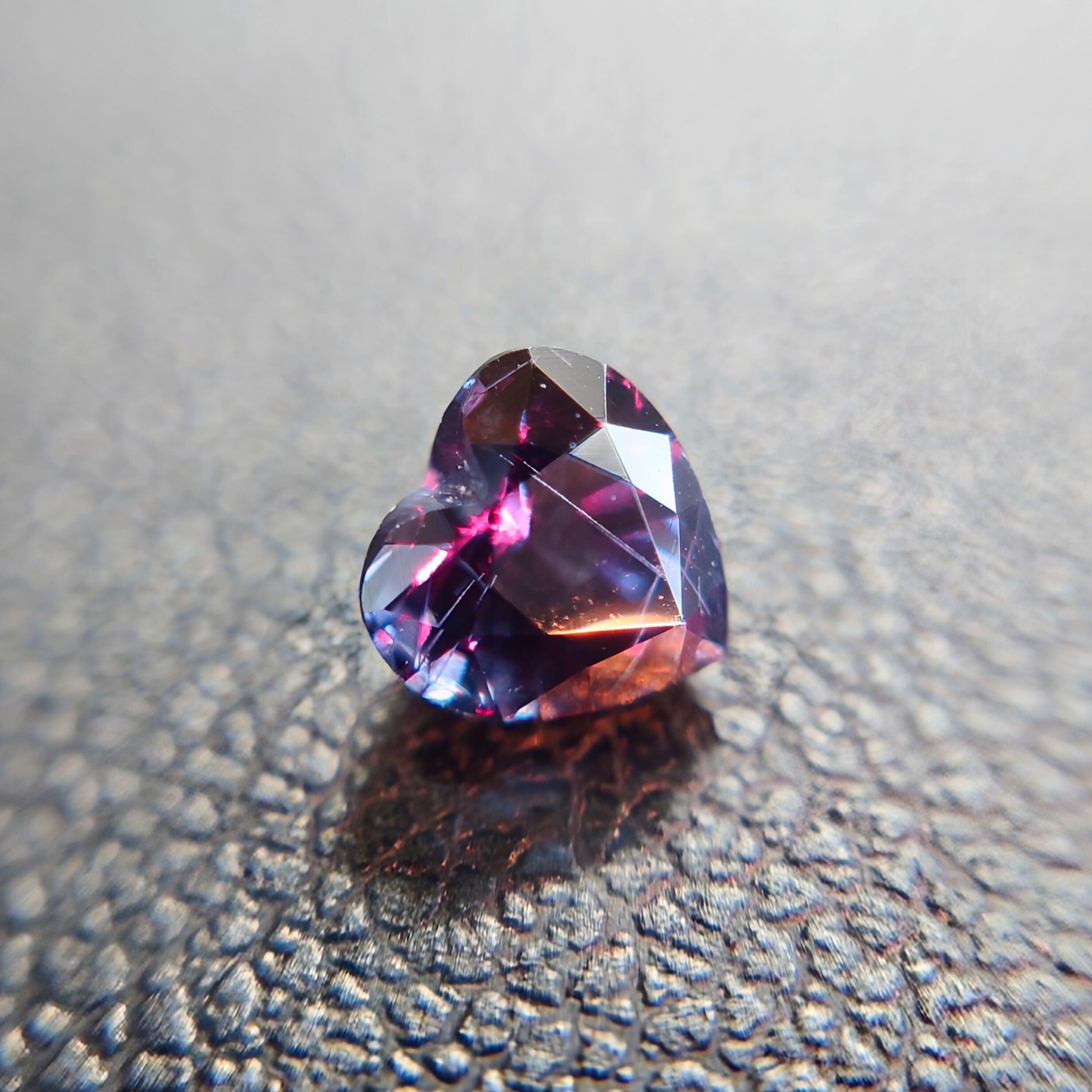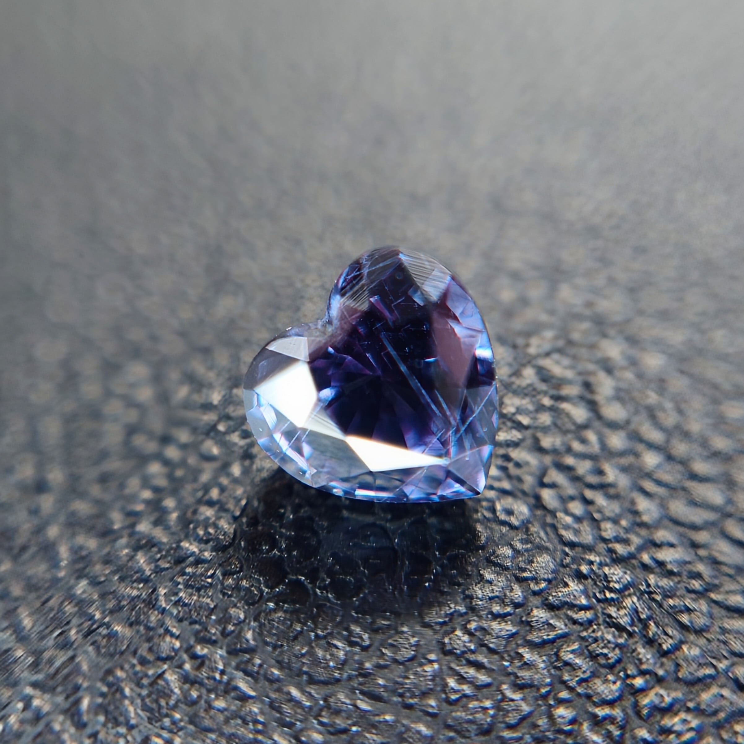 本石は、光源により劇的な色彩変化を見せるカラーチェンジタイプで、自然光下では落ち着いたブルー〜スチールブルー、白熱灯下では鮮やかなパープリッシュレッド〜ピンクへと表情を変える、まさに神秘的な一石です。