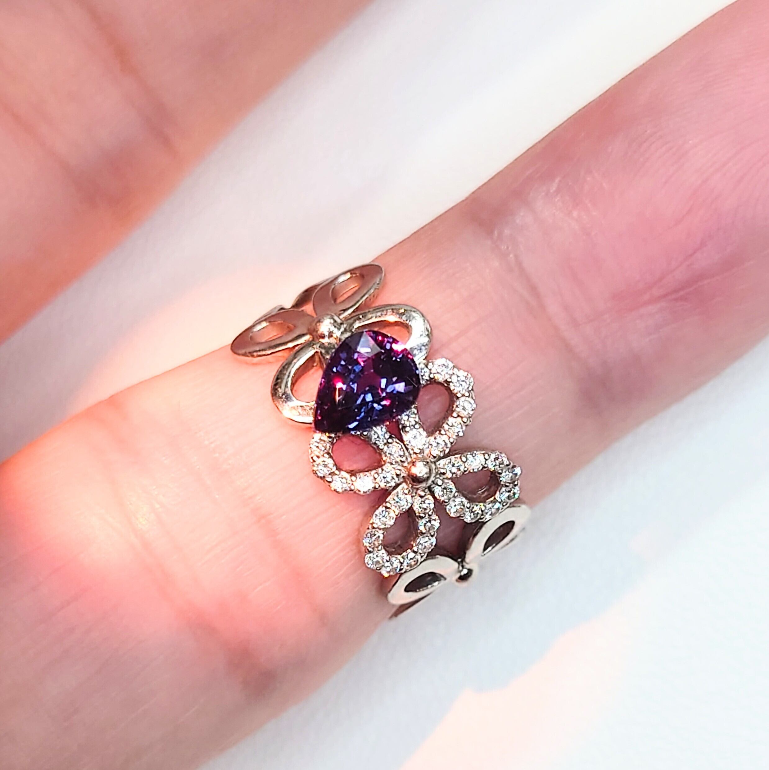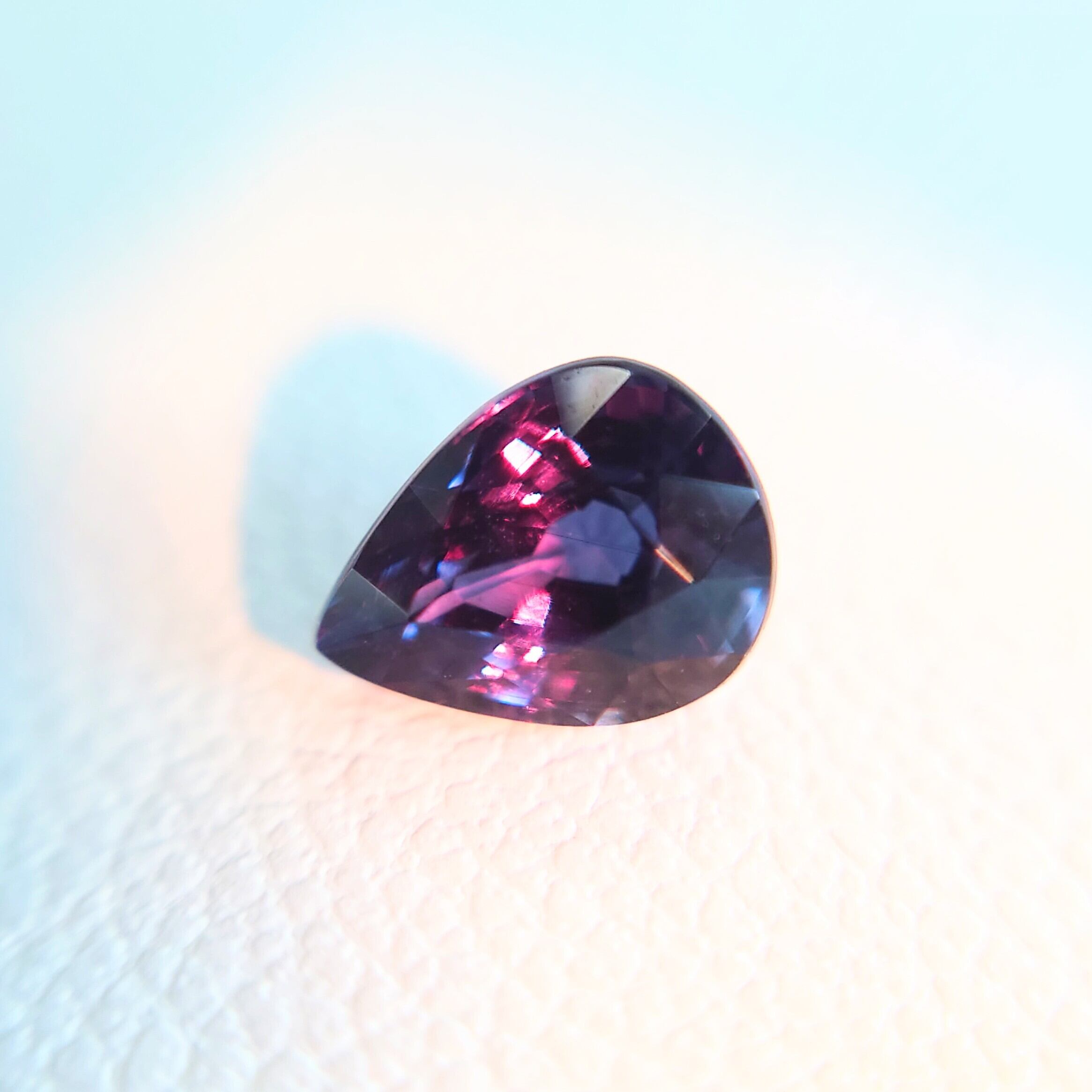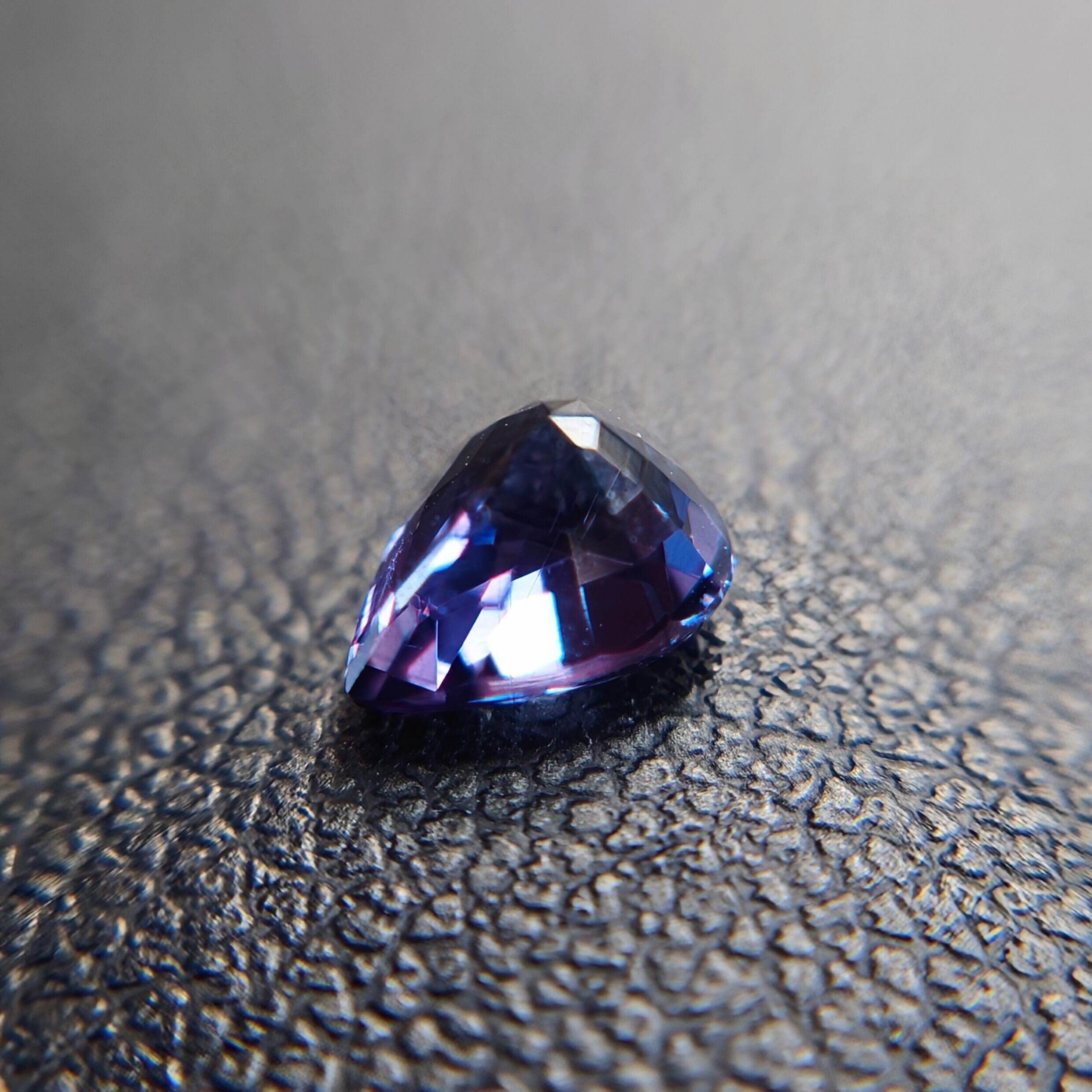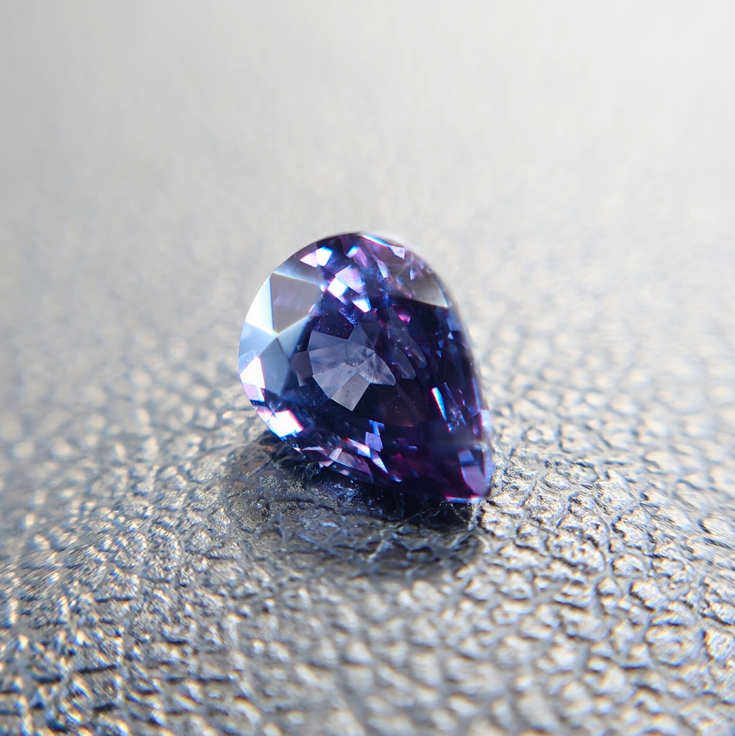 自然光下では、澄み渡るようなブルー〜バイオレットの洗練された色彩を見せ、光源が変わると一転して鮮やかなピンク〜レディッシュパープルへと劇的に変化。まるで異なる宝石を手にしているかのような、鮮烈なカラーチェンジをお楽しみいただけます。