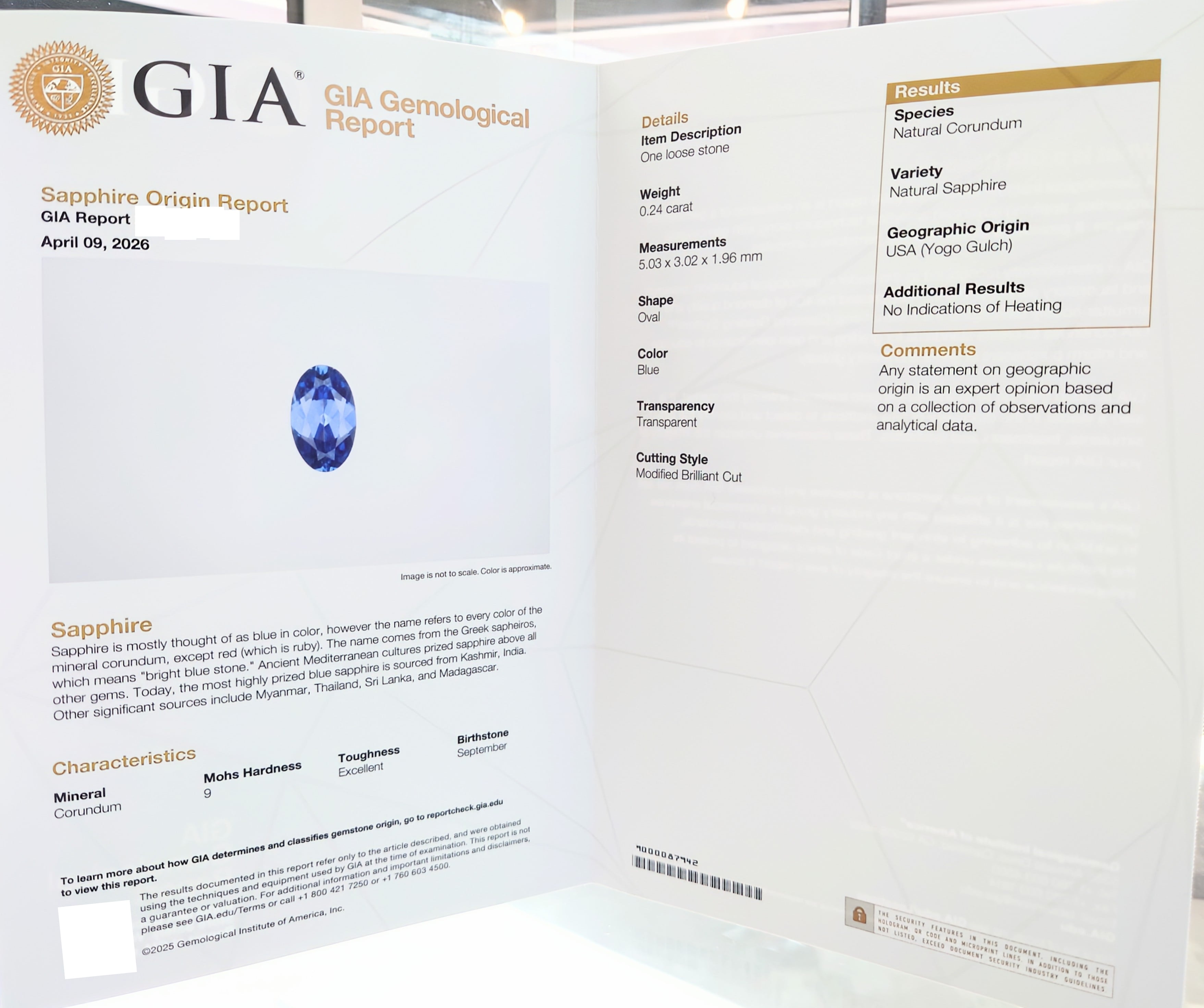 なかでも本石は、GIA産地鑑別付きでUSA(Yogo Gulch)の記載があり、さらにNo Indications of Heating(加熱の痕跡なし)とされた、コレクション性の高いピースです。