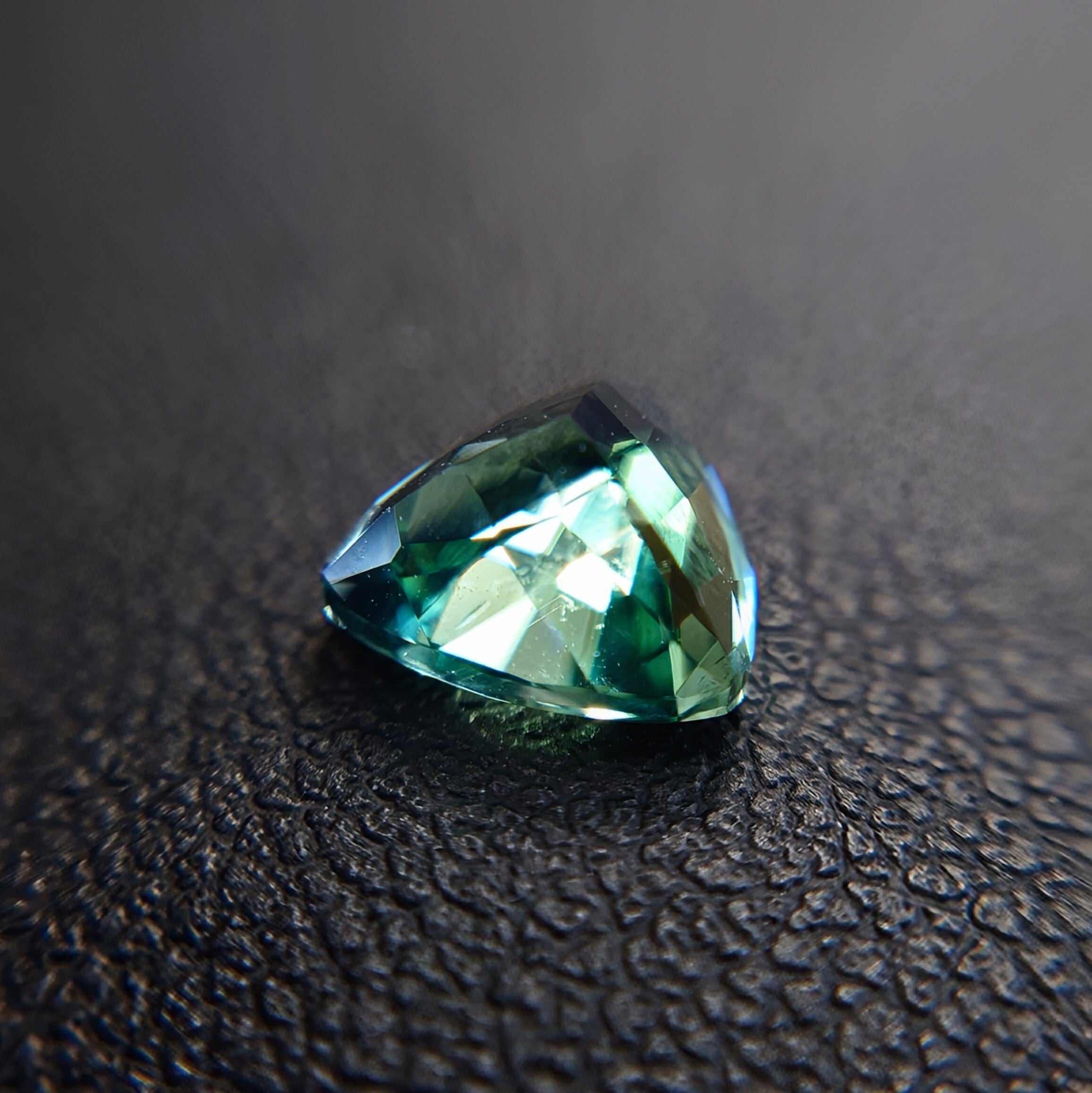 本石は1.53ctと、プリズマティンとしてはしっかりとしたサイズ感を有し、透明度も高く、光を受けた際には鮮やかなブルーイッシュグリーンのニュアンスが美しく変化。