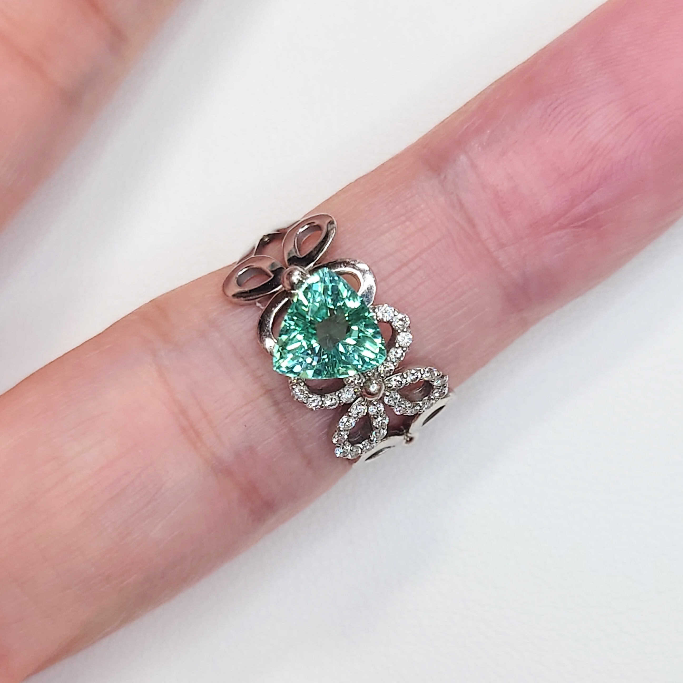 トライアングルカットならではのシャープな輪郭と、内部から湧き上がるような煌めきが相まって、独特の存在感を放ちます。