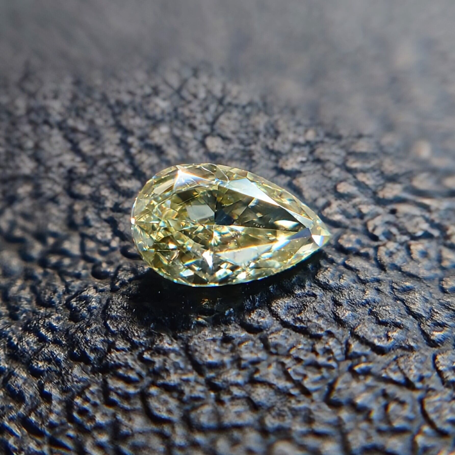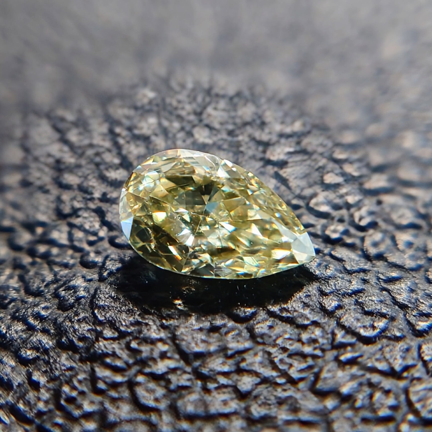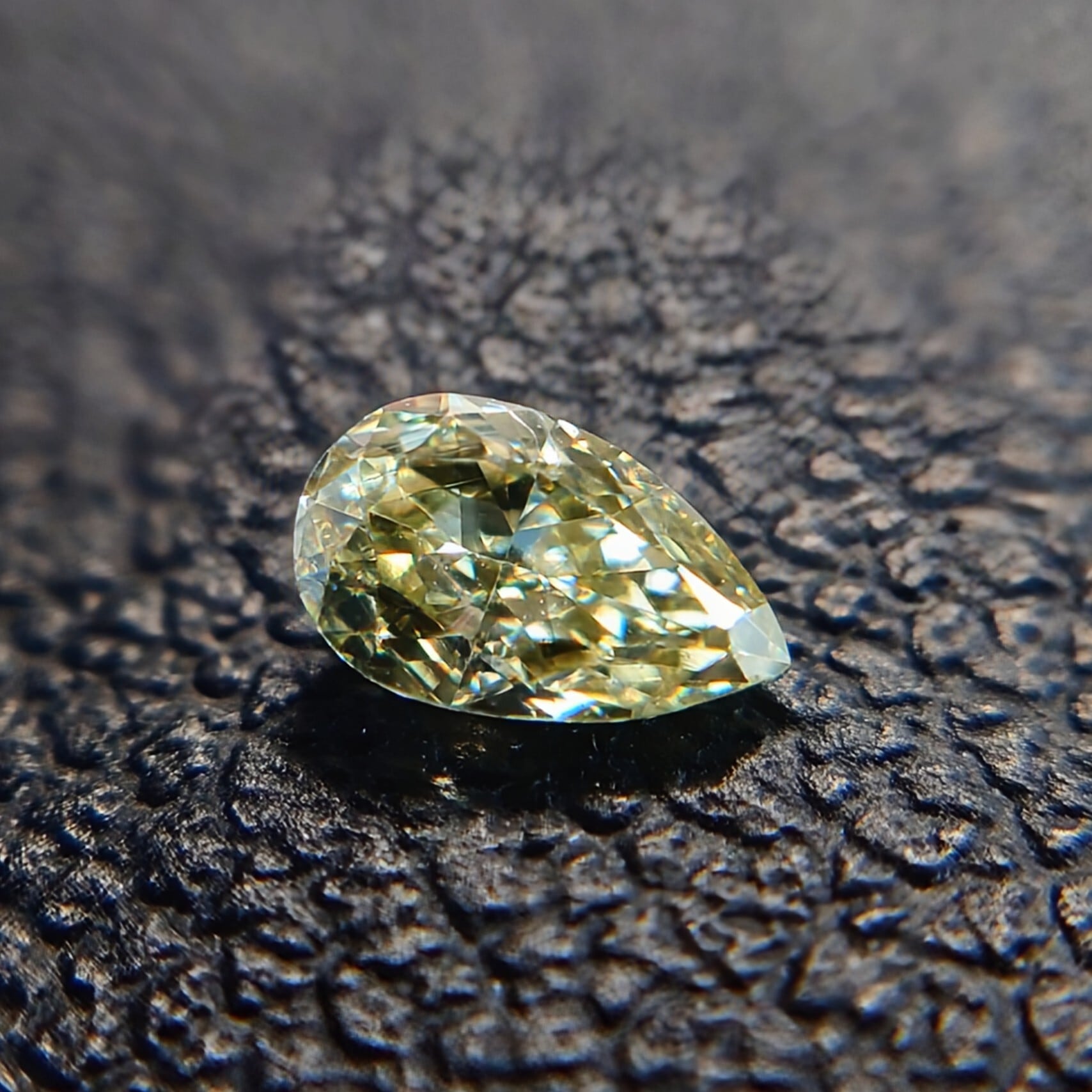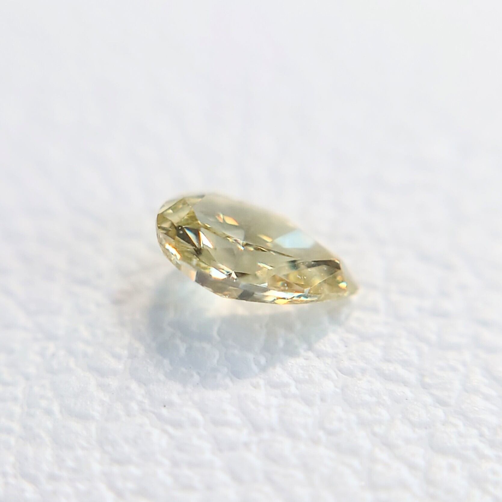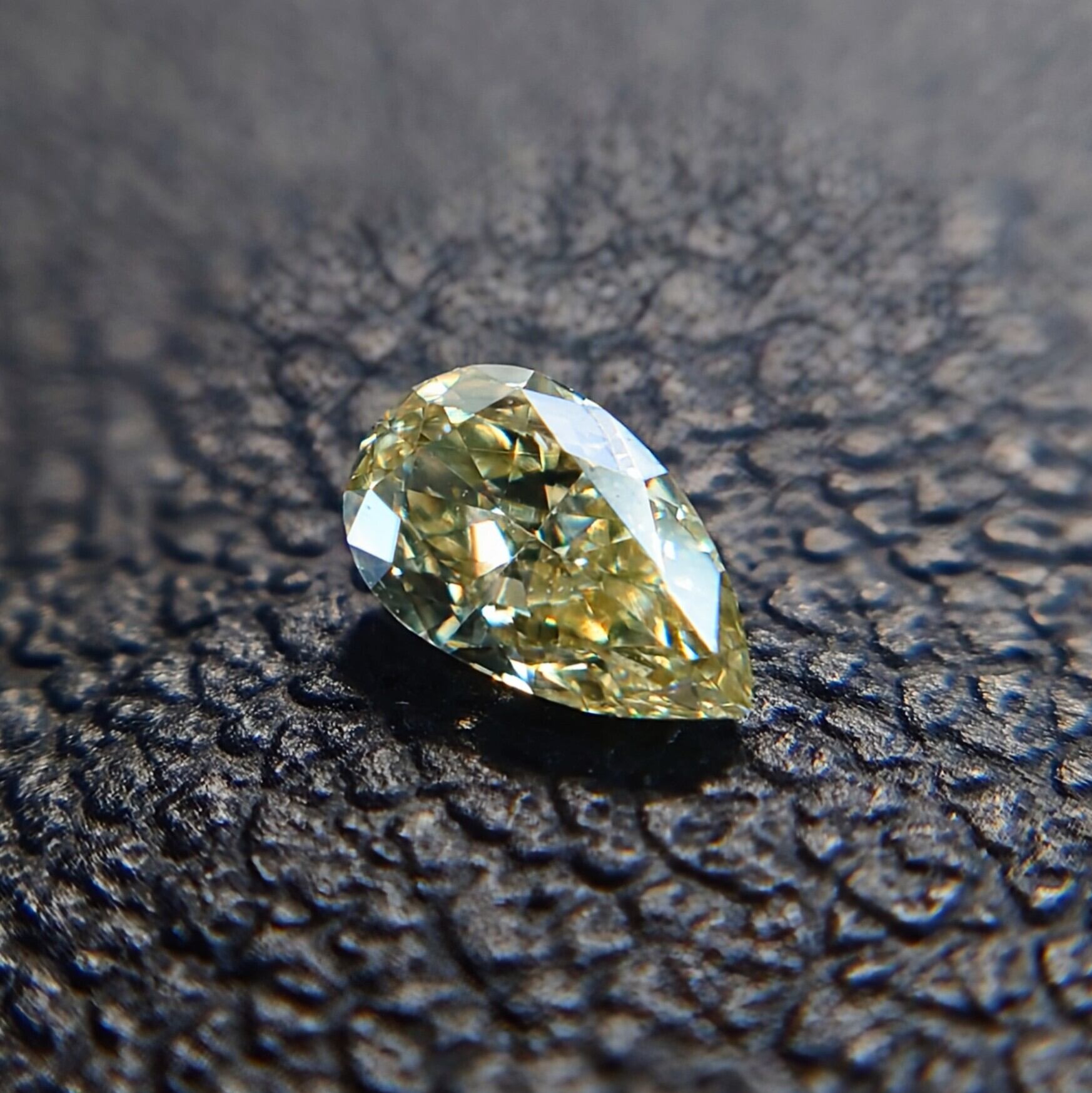 柔らかなイエローに、ほのかにグリーンとグレイのニュアンスを帯びた、非常に奥行きのあるカラーが魅力のカラーダイヤモンド。