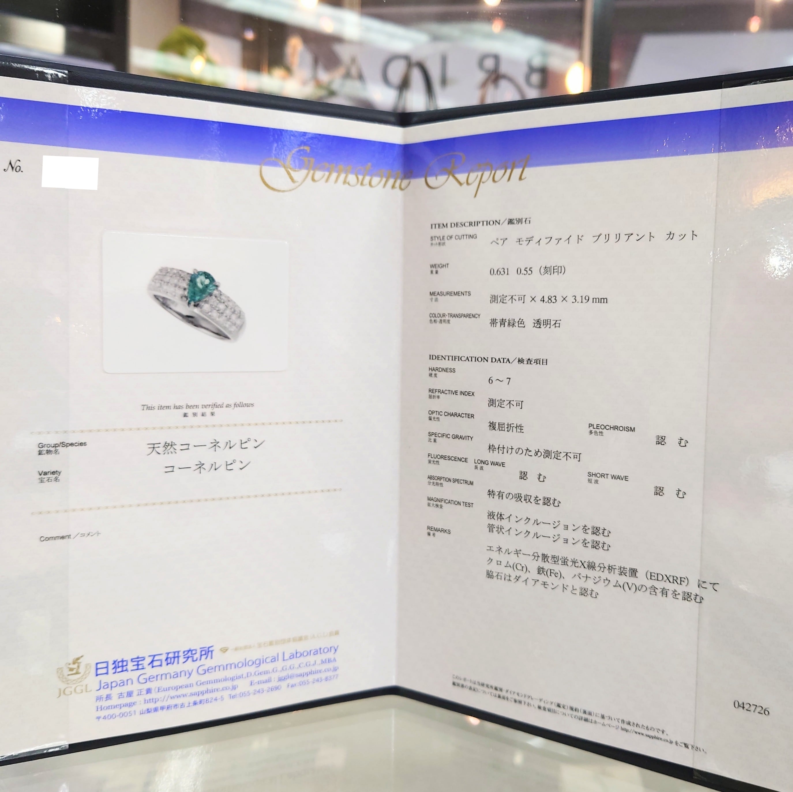 さらに、日本独宝石研究所(JGGL)による鑑別書が付属し、天然コーネルピンであることが証明された安心の品質。