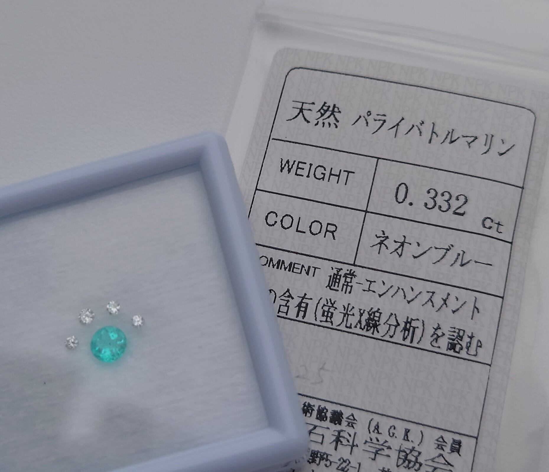 天然パライバトルマリン0.332ct(4.25×2.75)に、メレダイヤ4ピース(計0.1ct程)を配置した、にくきゅールースセットです♪