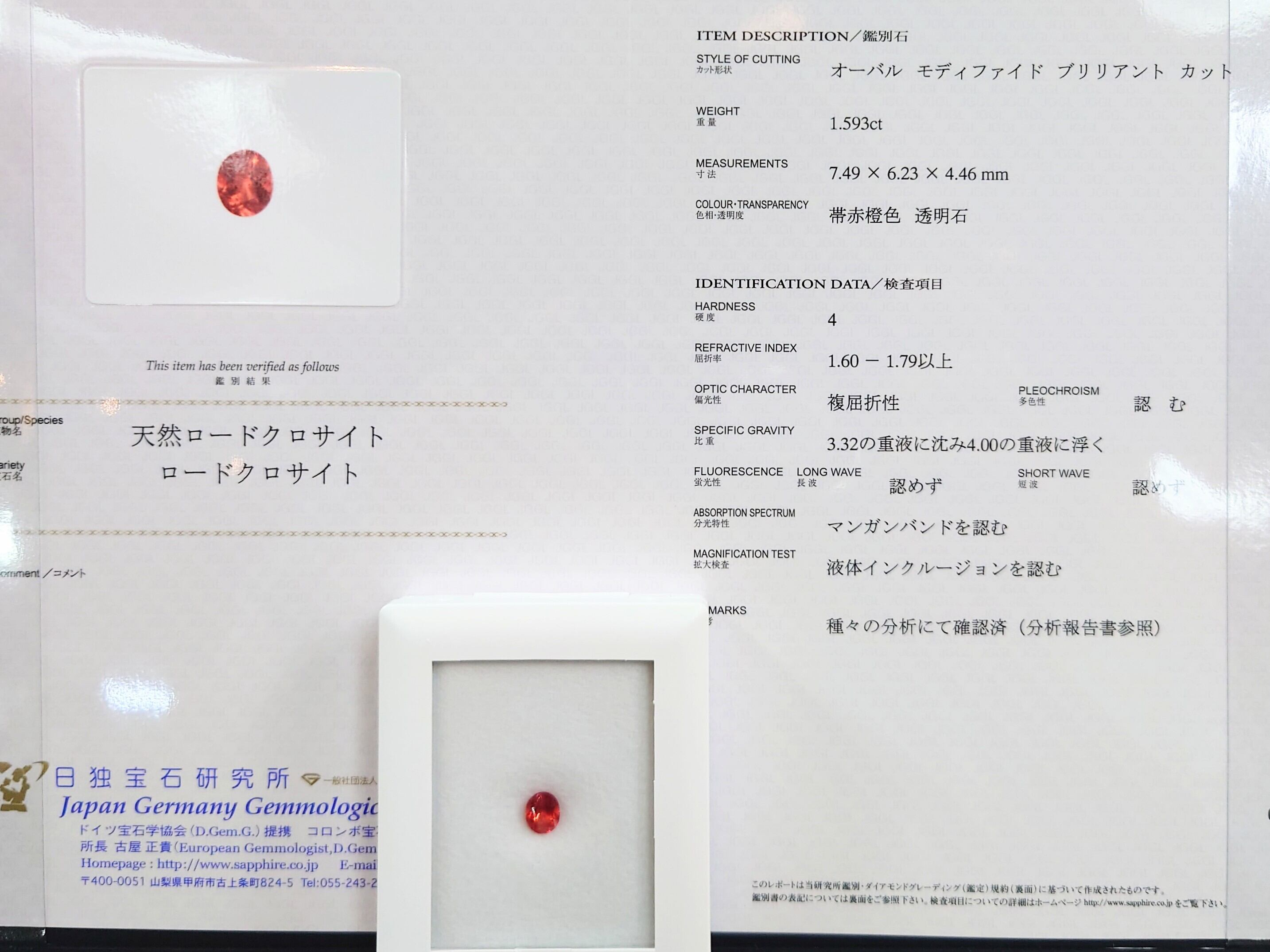 希少 Rhodochrosite South Africa 1.593ct 日独産地鑑別書付 ルース☆