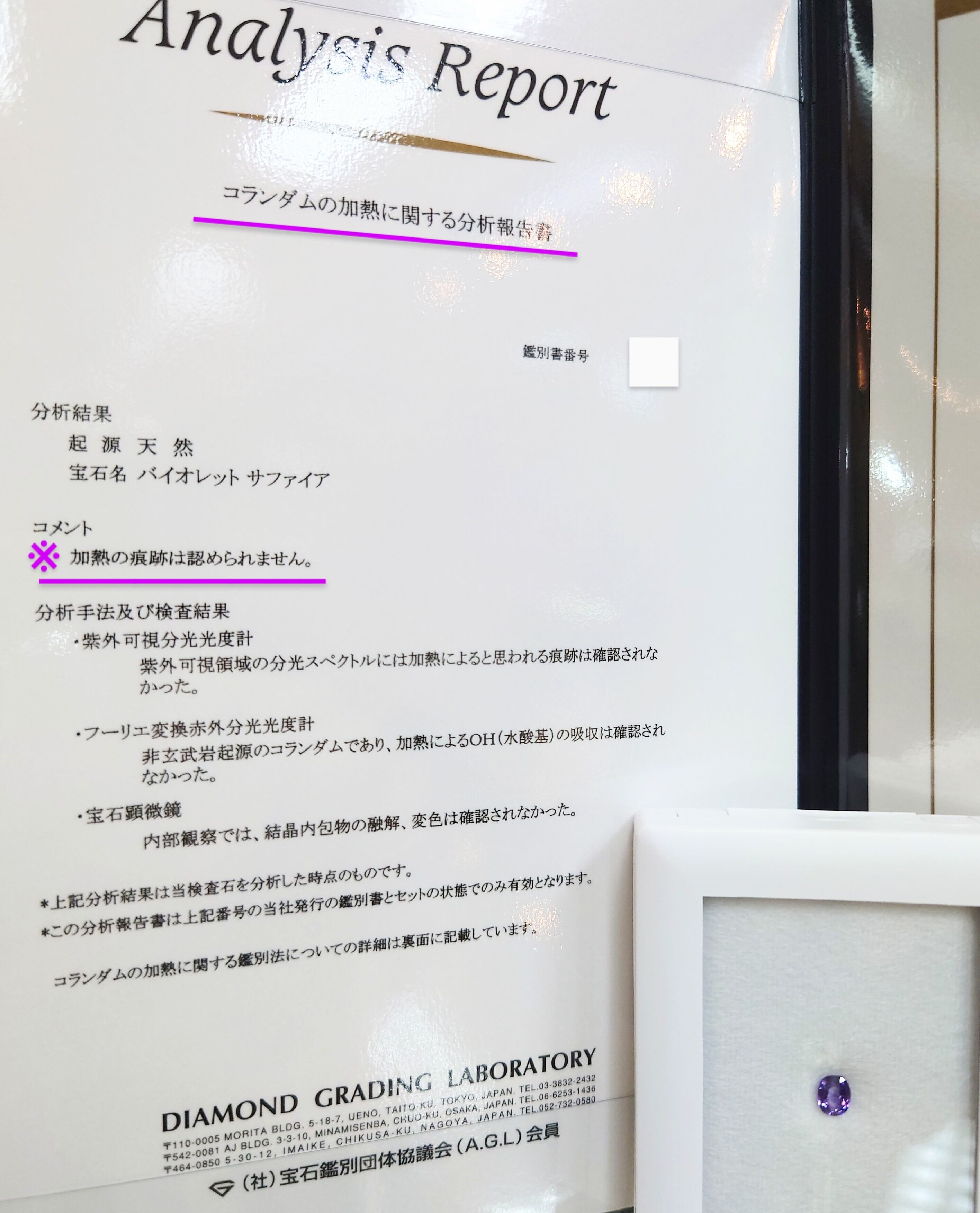 鑑定鑑別の権威AGL加盟、Diamond Grading Laboratory(DGL)の非加熱検査済みサブレポート付き♪