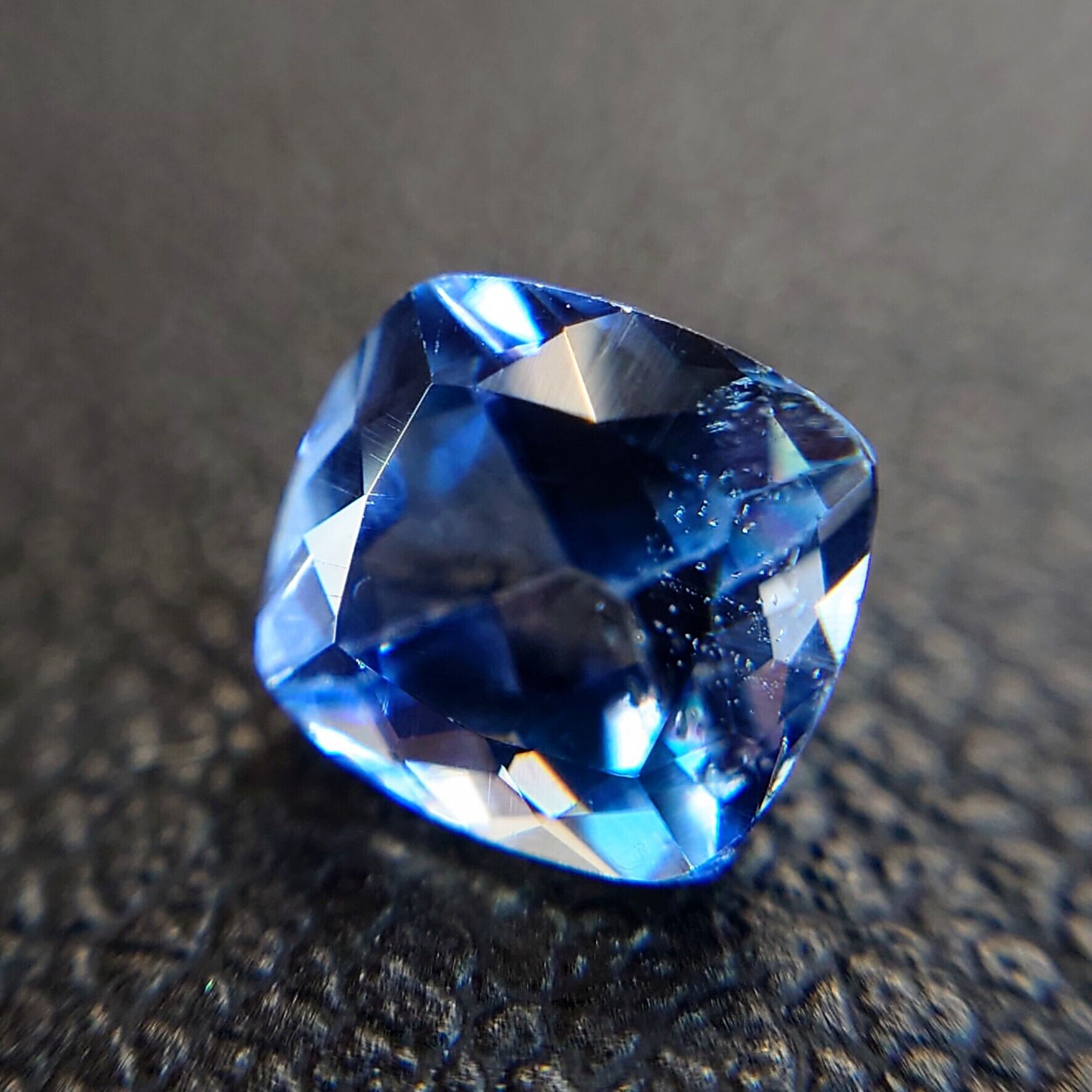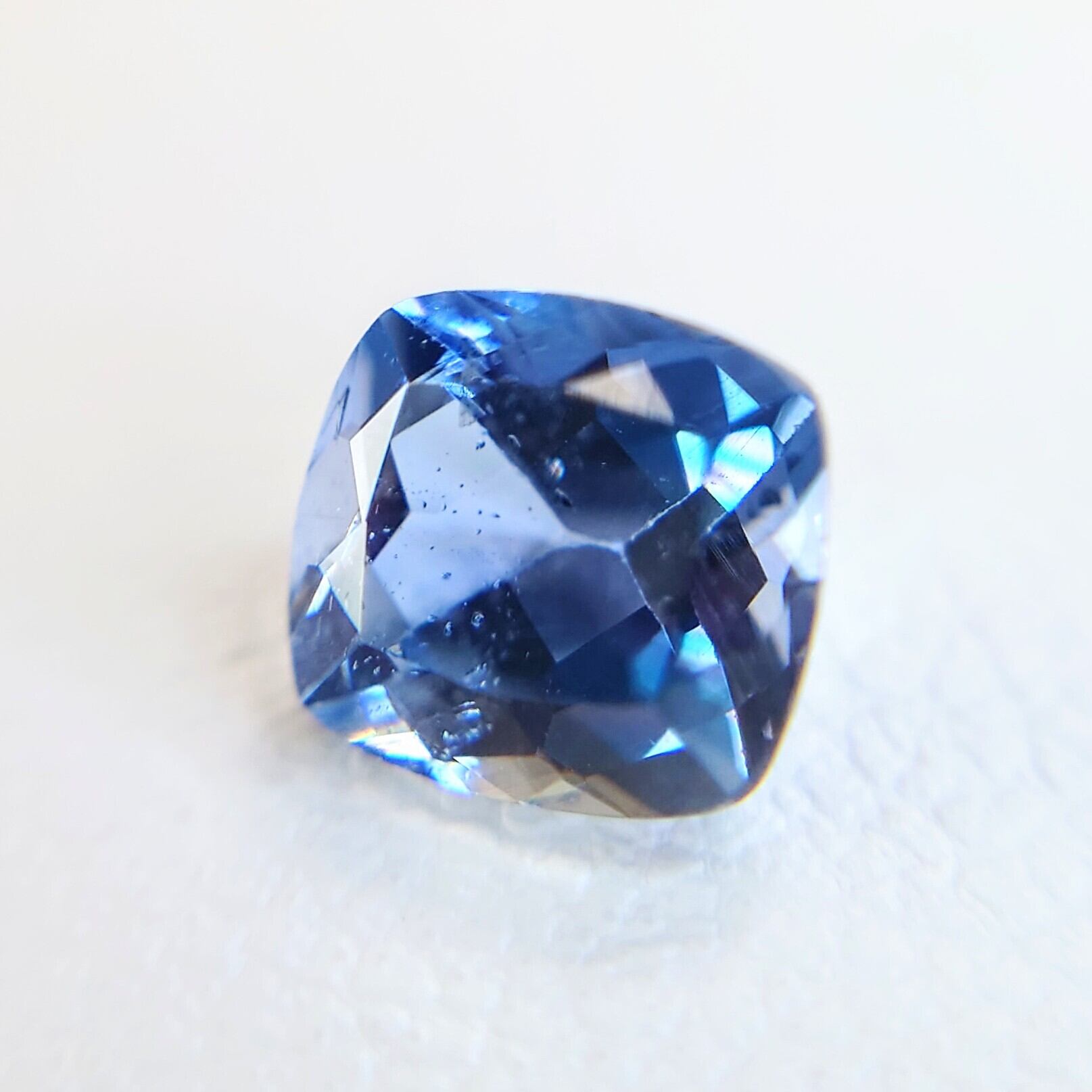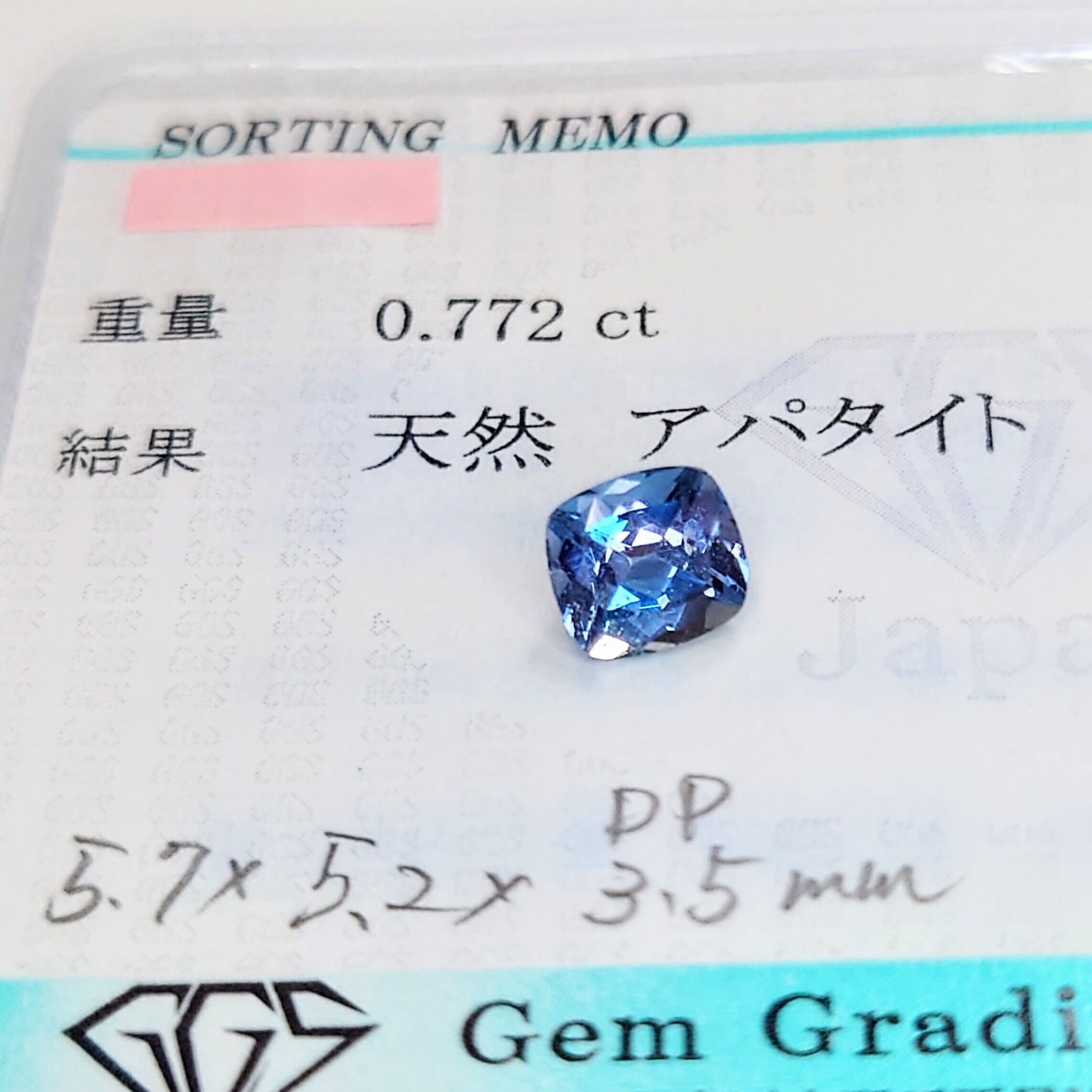 産地の特定は行っておりませんが、こちらのブルーアパタイトはインディゴ系のブルーの地色、多色性も強く、蛍光性もあり、何とも言えないホワイトとピンクが混ざりあった色に♪